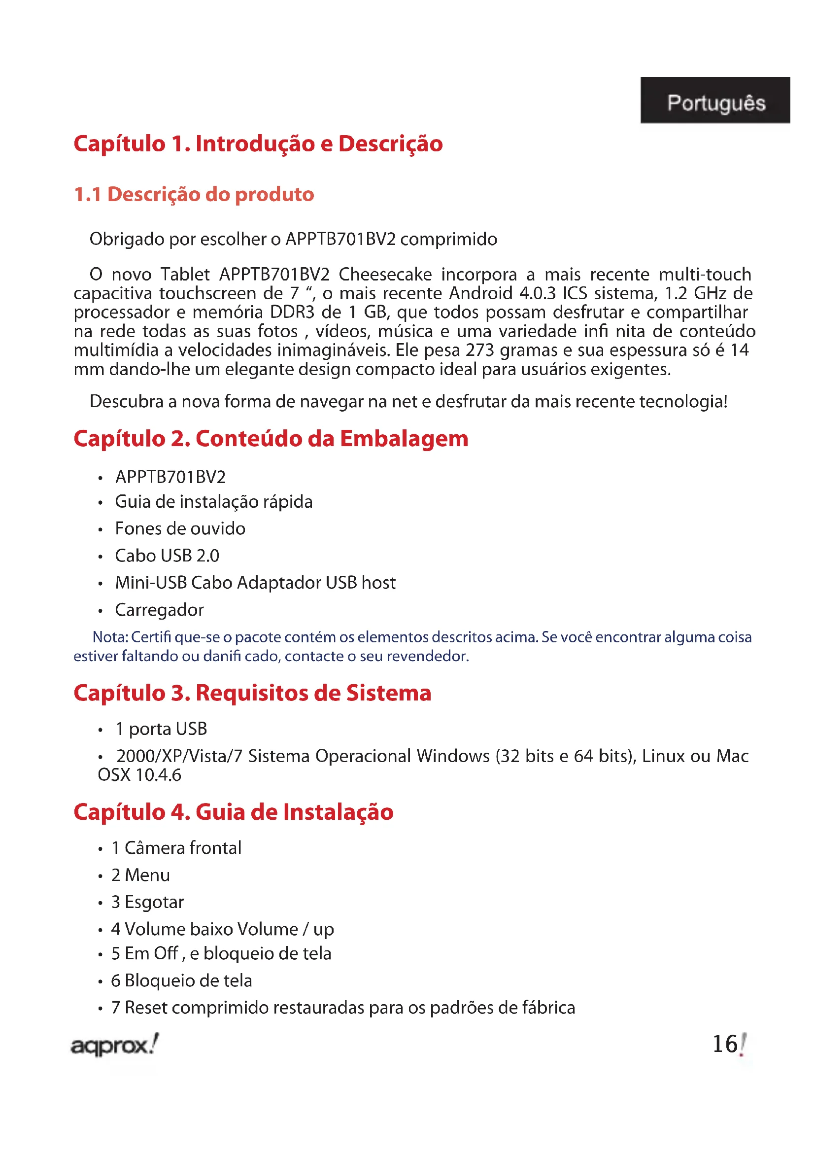 Obrigado por escolher o APPTB701BV2 comprimido O novo Tablet APPTB701BV2 Cheesecake incorpora a mais recente multi-touch capacitiva touchscreen de 7 “, o mais recente Android 4.0.3 ICS sistema, 1.2 GHz de processador e memória DDR3 de 1 GB, que todos possam desfrutar e compartilhar na rede todas as suas fotos , vídeos, música e uma variedade in nita de conteúdo multimídia a velocidades inimagináveis. Ele pesa 273 gramas e sua espessura só é 14 mm dando-lhe um elegante design compacto ideal para usuários exigentes. Descubra a nova forma de navegar na net e desfrutar da mais recente tecnologia! Capítulo 2. Conteúdo da Embalagem
