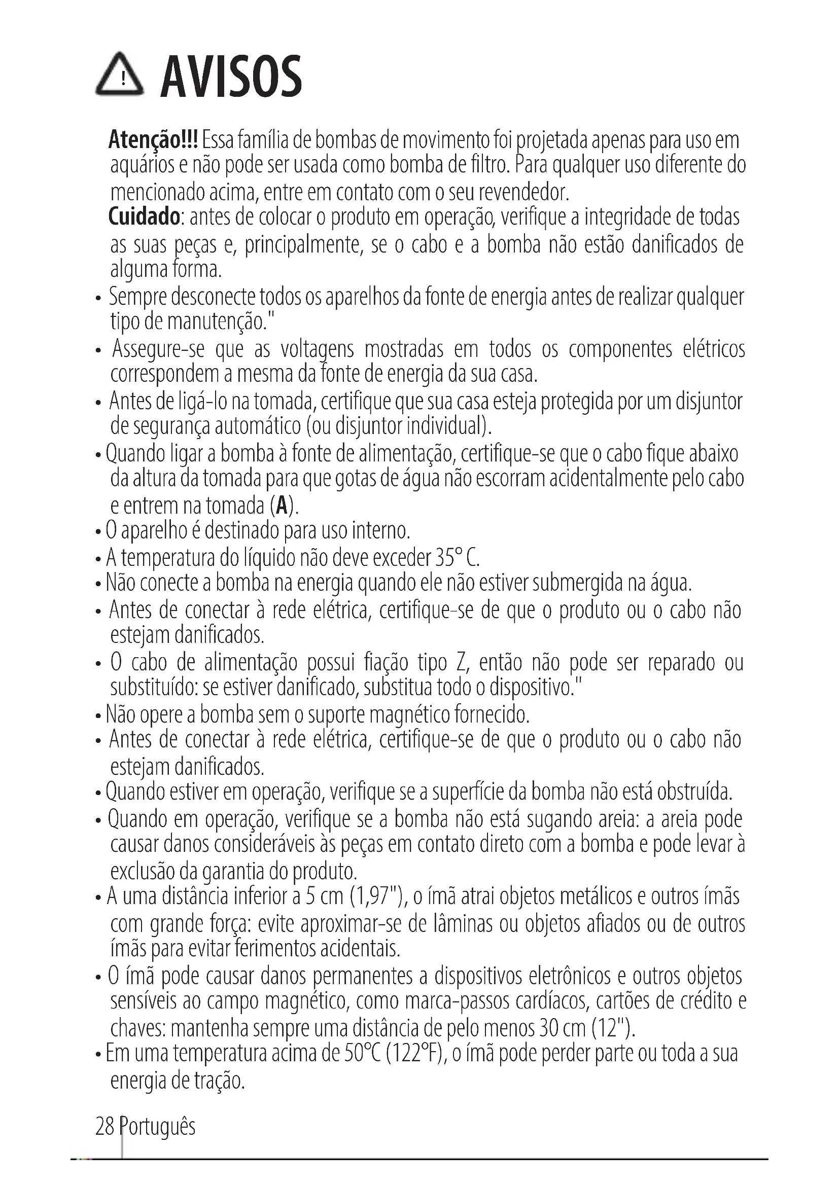 AVISOS Atenção!!! Essa família de bombas de movimento foi projetada apenas para uso em aquários e não pode ser usada como bomba de filtro. Para qualquer uso diferente do mencionado acima, entre em contato com o seu revendedor. Cuidado: antes de colocar o produto em operação, verifique a integridade de todas as suas peças e, principalmente, se o cabo e a bomba não estão danificados de alguma forma.