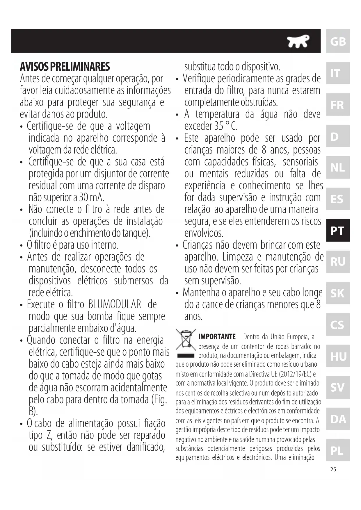 - Mantenha o aparelho e seu cabo longe do alcance de crianças menores que 8 anos. IMPORTANTE - Dentro da União Europeia, a presença de um contentor de rodas barrado: no produto, na documentação ou embalagem, indica que o produto não pode ser eliminado como resíduo urbano misto em conformidade com a Directiva UE (2012/19/EC) e com a normativa local vigente. O produto deve ser eliminado nos centros de recolha selectiva ou num depósito autorizado para a eliminação dos resíduos derivantes do fim de utilização dos equipamentos eléctricos e electrónicos em conformidade com as leis vigentes no país em que o produto se encontra. A gestão imprópria deste tipo de resíduos pode ter um impacto negativo no ambiente e na saúde humana provocado pelas substâncias potencialmente perigosas produzidas pelos equipamentos eléctricos e electrónicos. Uma eliminação BLUMODULAR 360069-3_FI BLUMODULAR.indd 25 09/08/18 14:4326