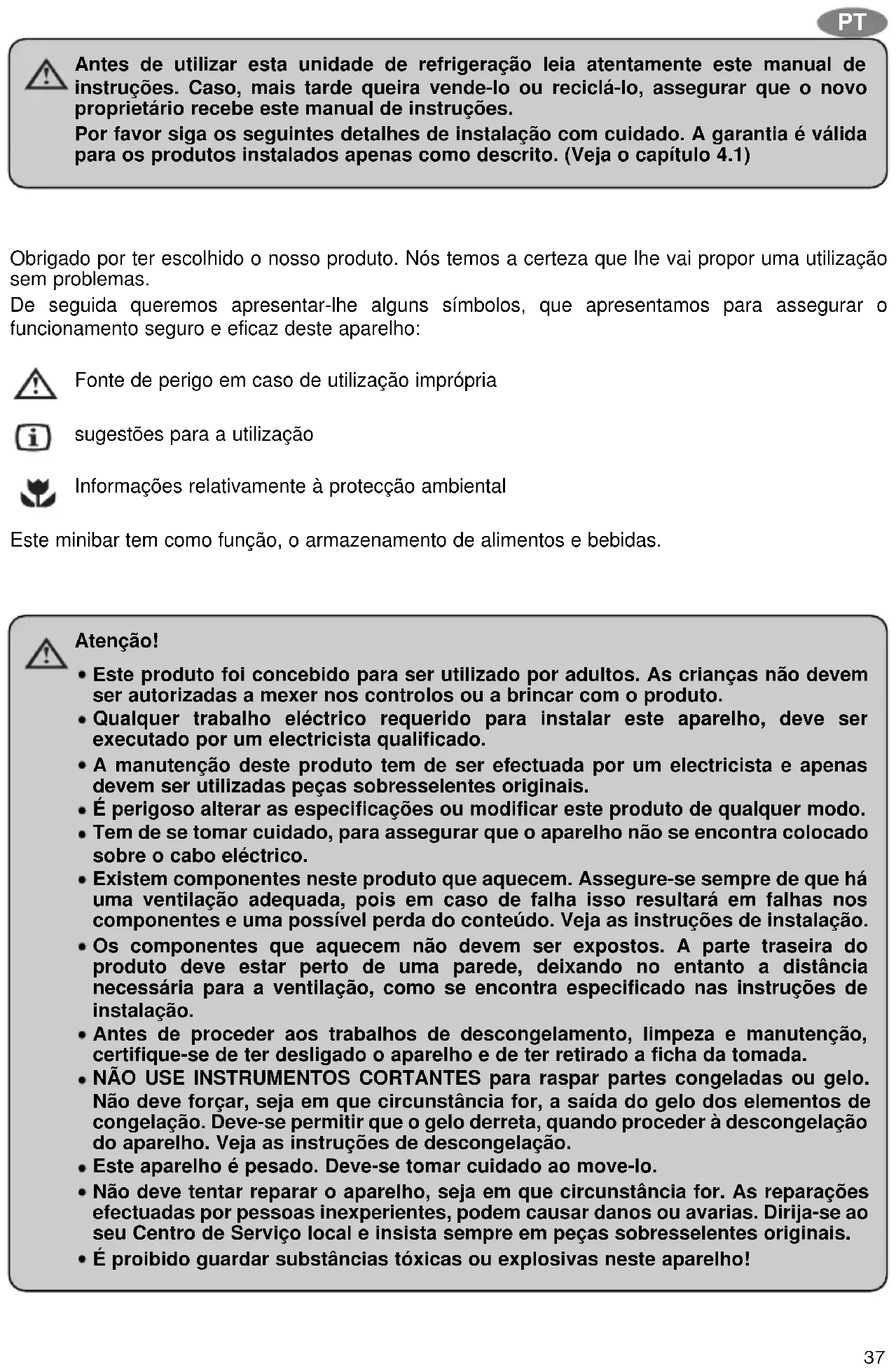 Nadat u de koelkast heeft uitgepakt, brengt u het verpakkingsmateriaal bij voorkeur naar een plaatselijk inzamelpunt. Na het einde van de levensduur moet de koelkast worden ingeleverd bij een gemeentelijk inzameldepot of bij een gespecialiseerd inzamel- en recyclingbedrijf, dat de nog recyclebare materialen terug zal winnen. Het restant wordt volledig vernietigd. Apparaten, die met dit symbool zijn voorzien, moeten bij het gemeentelijk verzamelpunt voor afgedankte elektrische en electronische apparatuur worden afgegeven. Ze mogen niet via het gewone huisafval worden weggegooid. Bij koelkasten van Dometic staat het symbool op het typeplaatje aan de binnenkant van het apparaat. Dit toestel voldoet aan de EU-richtlijnen als volgt: LVD-Richtlijn 73/23/EEG, gewijzigd bij 90/683/EEG. EMC-Richtlijn 89/336/EEG. RoHS-Richtlijn 2002/95/EG.37 Obrigado por ter escolhido o nosso produto. Nós temos a certeza que lhe vai propor uma utilização sem problemas. De seguida queremos apresentar-lhe alguns símbolos, que apresentamos para assegurar o funcionamento seguro e eficaz deste aparelho: Fonte de perigo em caso de utilização imprópria sugestões para a utilização Informações relativamente à protecção ambiental Este minibar tem como função, o armazenamento de alimentos e bebidas. Atenção! Este produto foi concebido para ser utilizado por adultos. As crianças não devem ser autorizadas a mexer nos controlos ou a brincar com o produto. Qualquer trabalho eléctrico requerido para instalar este aparelho, deve ser executado por um electricista qualificado. A manutenção deste produto tem de ser efectuada por um electricista e apenas devem ser utilizadas peças sobresselentes originais. É perigoso alterar as especificações ou modificar este produto de qualquer modo. Tem de se tomar cuidado, para assegurar que o aparelho não se encontra colocado sobre o cabo eléctrico. Existem componentes neste produto que aquecem. Assegure-se sempre de que há uma ventilação adequada, pois em caso de falha isso resultará em falhas nos componentes e uma possível perda do conteúdo. Veja as instruções de instalação. Os componentes que aquecem não devem ser expostos. A parte traseira do produto deve estar perto de uma parede, deixando no entanto a distância necessária para a ventilação, como se encontra especificado nas instruções de instalação. Antes de proceder aos trabalhos de descongelamento, limpeza e manutenção, certifique-se de ter desligado o aparelho e de ter retirado a ficha da tomada. NÃO USE INSTRUMENTOS CORTANTES para raspar partes congeladas ou gelo. Não deve forçar, seja em que circunstância for, a saída do gelo dos elementos de congelação. Deve-se permitir que o gelo derreta, quando proceder à descongelação do aparelho. Veja as instruções de descongelação. Este aparelho é pesado. Deve-se tomar cuidado ao move-lo. Não deve tentar reparar o aparelho, seja em que circunstância for. As reparações efectuadas por pessoas inexperientes, podem causar danos ou avarias. Dirija-se ao seu Centro de Serviço local e insista sempre em peças sobresselentes originais. É proibido guardar substâncias tóxicas ou explosivas neste aparelho! Antes de utilizar esta unidade de refrigeração leia atentamente este manual de instruções. Caso, mais tarde queira vende-lo ou reciclá-lo, assegurar que o novo proprietário recebe este manual de instruções. Por favor siga os seguintes detalhes de instalação com cuidado. A garantia é válida para os produtos instalados apenas como descrito. (Veja o capítulo 4.1) PT38 ÍNDICE
