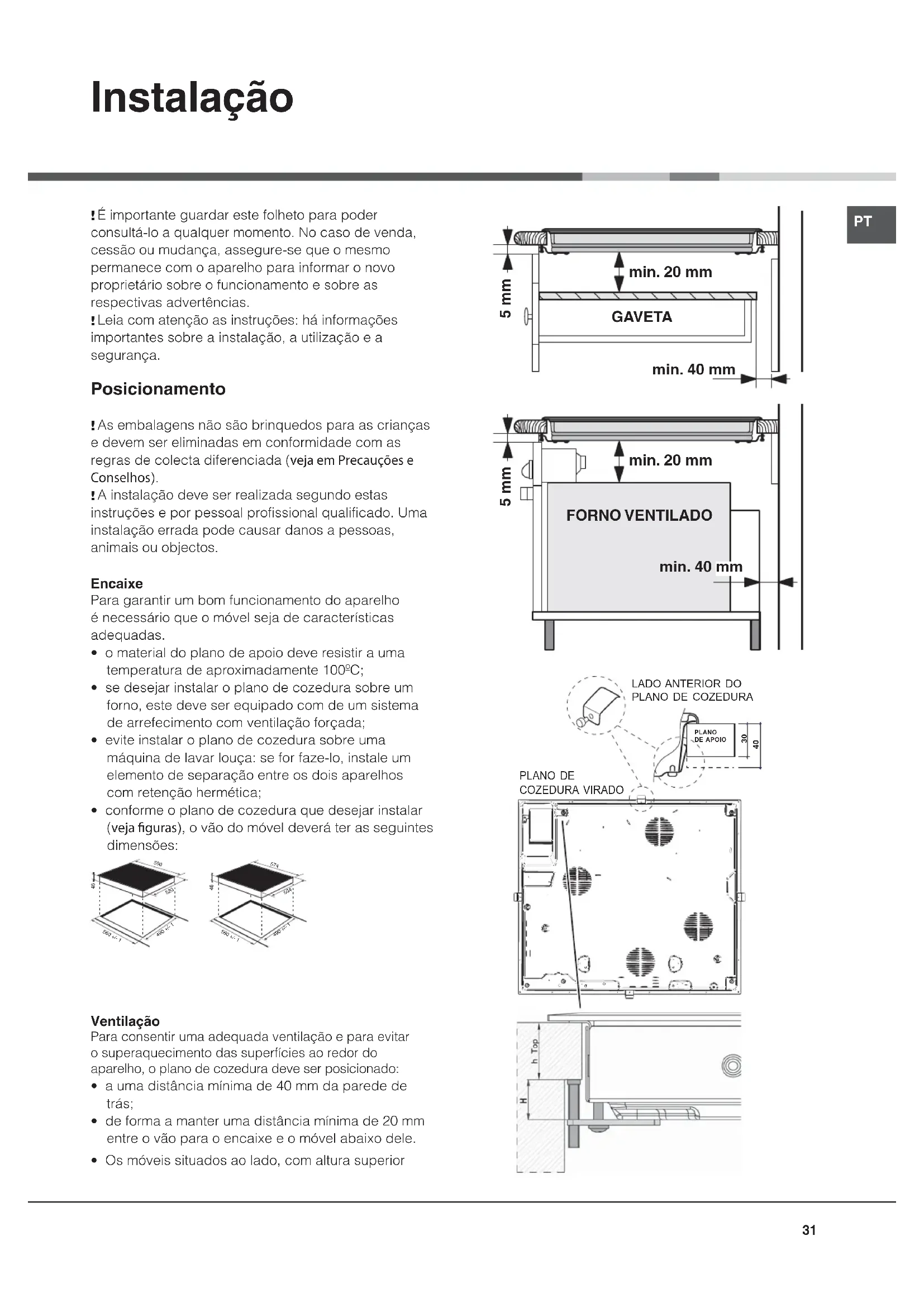- se desejar instalar o plano de cozedura sobre um forno, este deve ser equipado com de um sistema de arrefecimento com ventilação forçada;