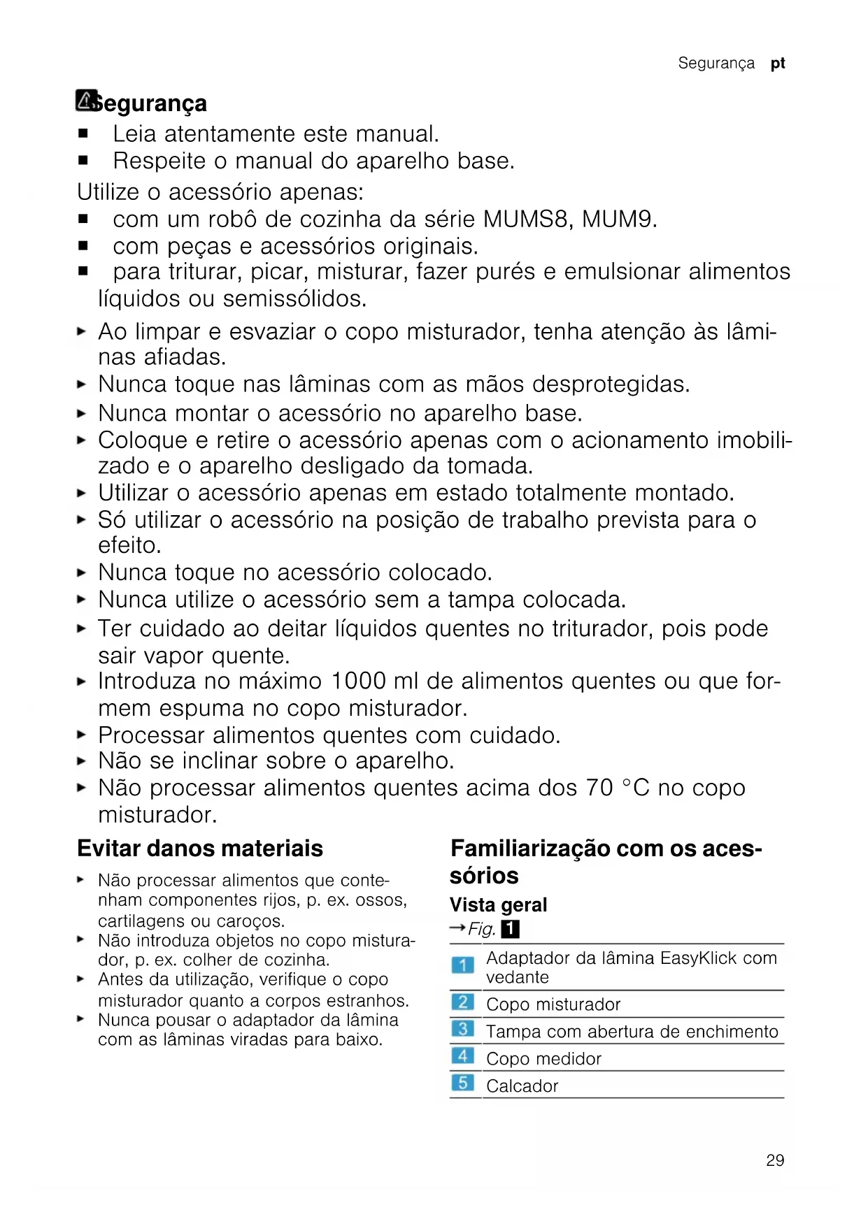 Adaptador da lâmina EasyKlick com vedante Copo misturador Tampa com abertura de enchimento Copo medidor Calcador 29pt Utilização UtilizaçãoUtilização Vista geral dos aparelhos base Este acessório pode ser utilizado com dife- rentes aparelhos base. Prepare o robô de cozinha como ilustrado. Fig.
