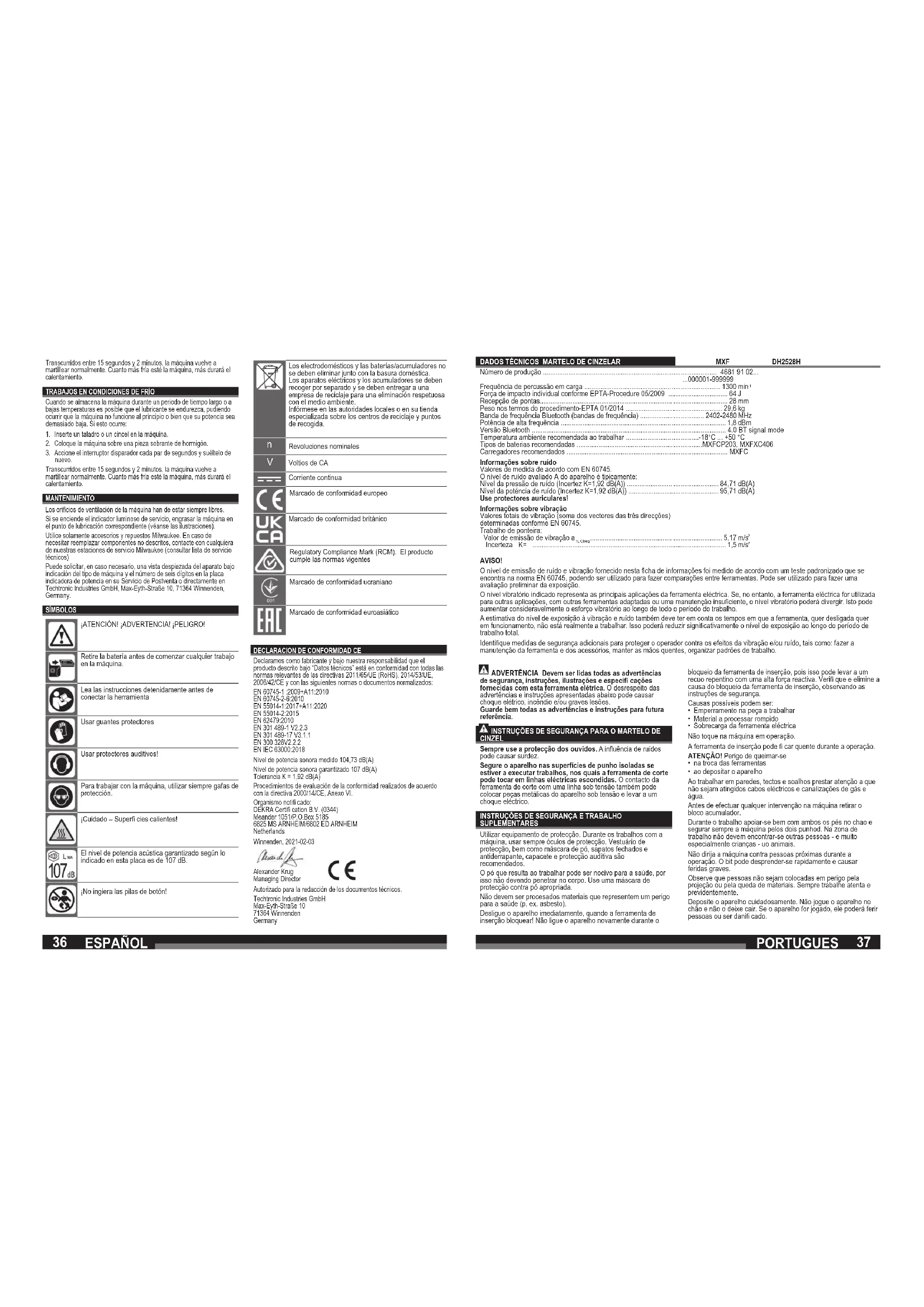 Como fabricante, declaramos sob responsabilidade exclusiva, que o produto descrito sob “Dados Técnicos” corresponde com todas as disposições relevantes das diretivas 2011/65/UE (RoHS), 2014/53UE, 2006/42/CE e dos seguintes documentos normativos harmonizados: EN 60745-1 :2009+A11:2010 EN 60745-2-6:2010 EN 55014-1:2017+A11:2020 EN 55014-2:2015 EN 62479:2010 EN 301 489-1 V2.2.3 EN 301 489-17 V3.1.1 EN 300 328V2.2.2 EN IEC 63000:2018 Nível de potência acústica medido 104,73 dB(A) Nível de potência acústica garantido 107 dB(A) Incertez K = 1,92 dB(A) Processo de avaliação da conformidade nos termos da 2000/14/ CE apêndice VI. Organismo notifi cado: DEKRA Certifi cation B.V. (0344) Meander 1051/P.O.Box 5185