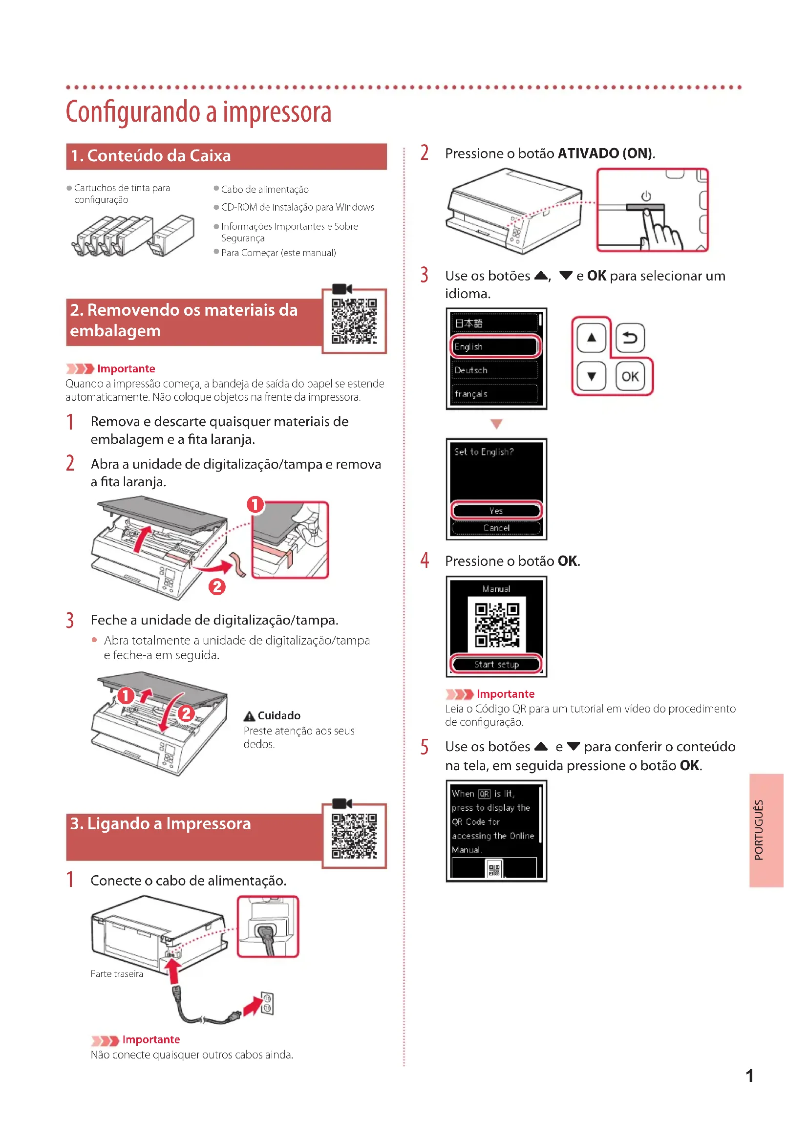Cartuchos de tinta para configuração Cabo de alimentação CD-ROM de instalação para Windows Informações Importantes e Sobre Segurança Para Começar (este manual)