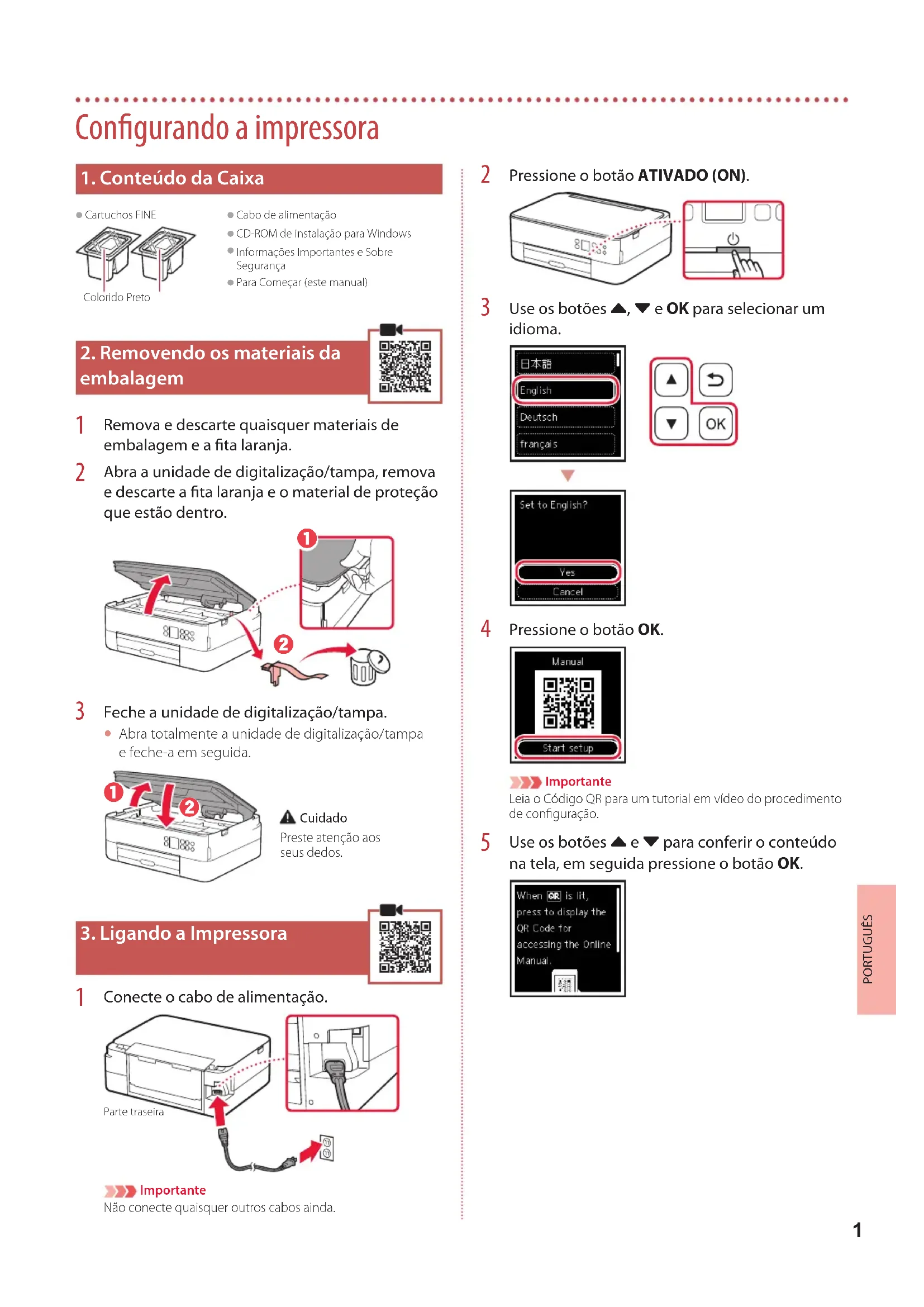 Use os botões { e } para conferir o conteúdo na tela, em seguida pressione o botão OK.2 Configurando a impressora