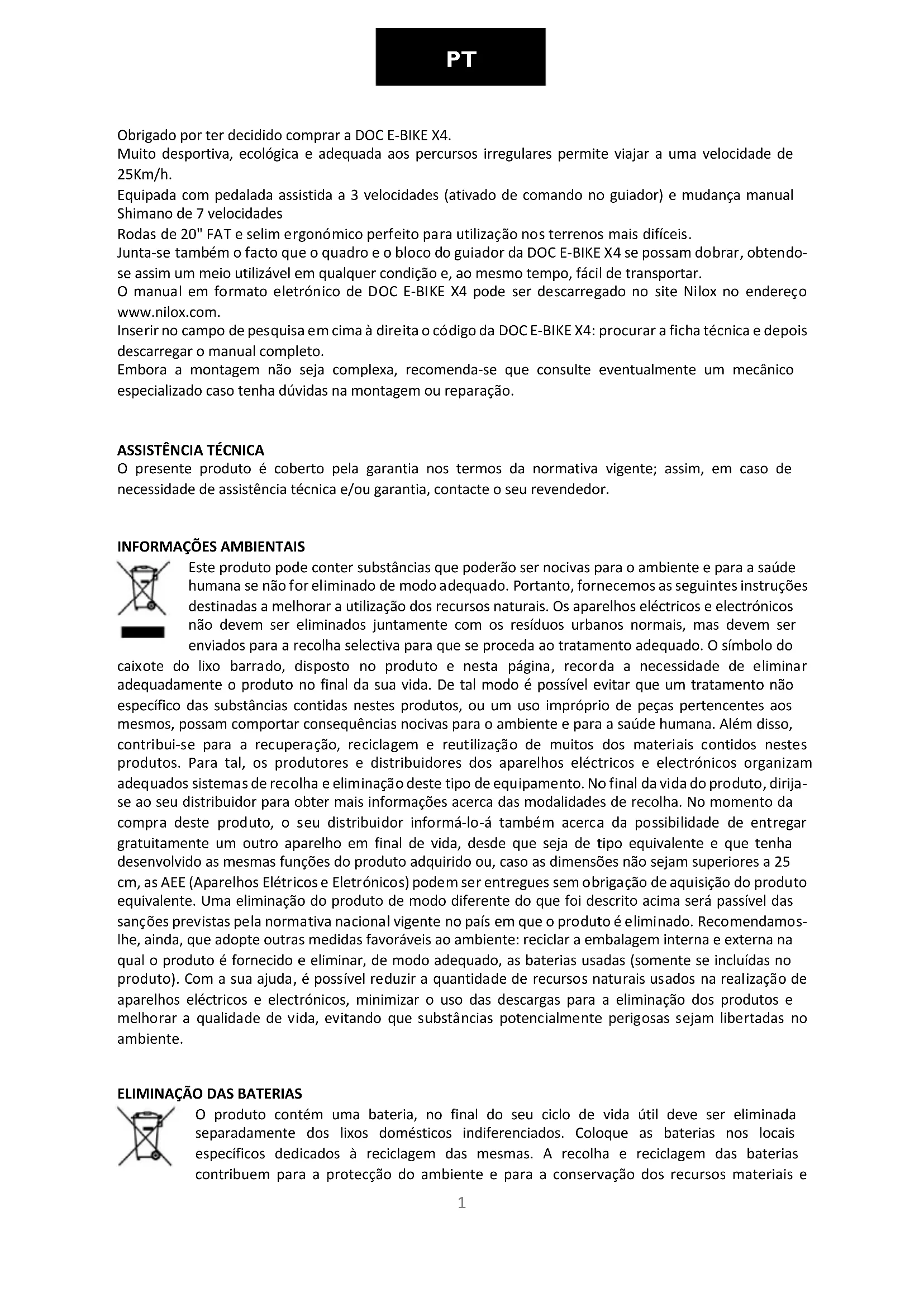 Obrigado por ter decidido comprar a DOC E-BIKE X4. Muito desportiva, ecológica e adequada aos percursos irregulares permite viajar a uma velocidade de 25Km/h. Equipada com pedalada assistida a 3 velocidades (ativado de comando no guiador) e mudança manual Shimano de 7 velocidades Rodas de 20" FAT e selim ergonómico perfeito para utilização nos terrenos mais difíceis. Junta-se também o facto que o quadro e o bloco do guiador da DOC E-BIKE X4 se possam dobrar, obtendo- se assim um meio utilizável em qualquer condição e, ao mesmo tempo, fácil de transportar. O manual em formato eletrónico de DOC E-BIKE X4 pode ser descarregado no site Nilox no endereço www.nilox.com. Inserir no campo de pesquisa em cima à direita o código da DOC E-BIKE X4: procurar a ficha técnica e depois descarregar o manual completo. Embora a montagem não seja complexa, recomenda-se que consulte eventualmente um mecânico especializado caso tenha dúvidas na montagem ou reparação.