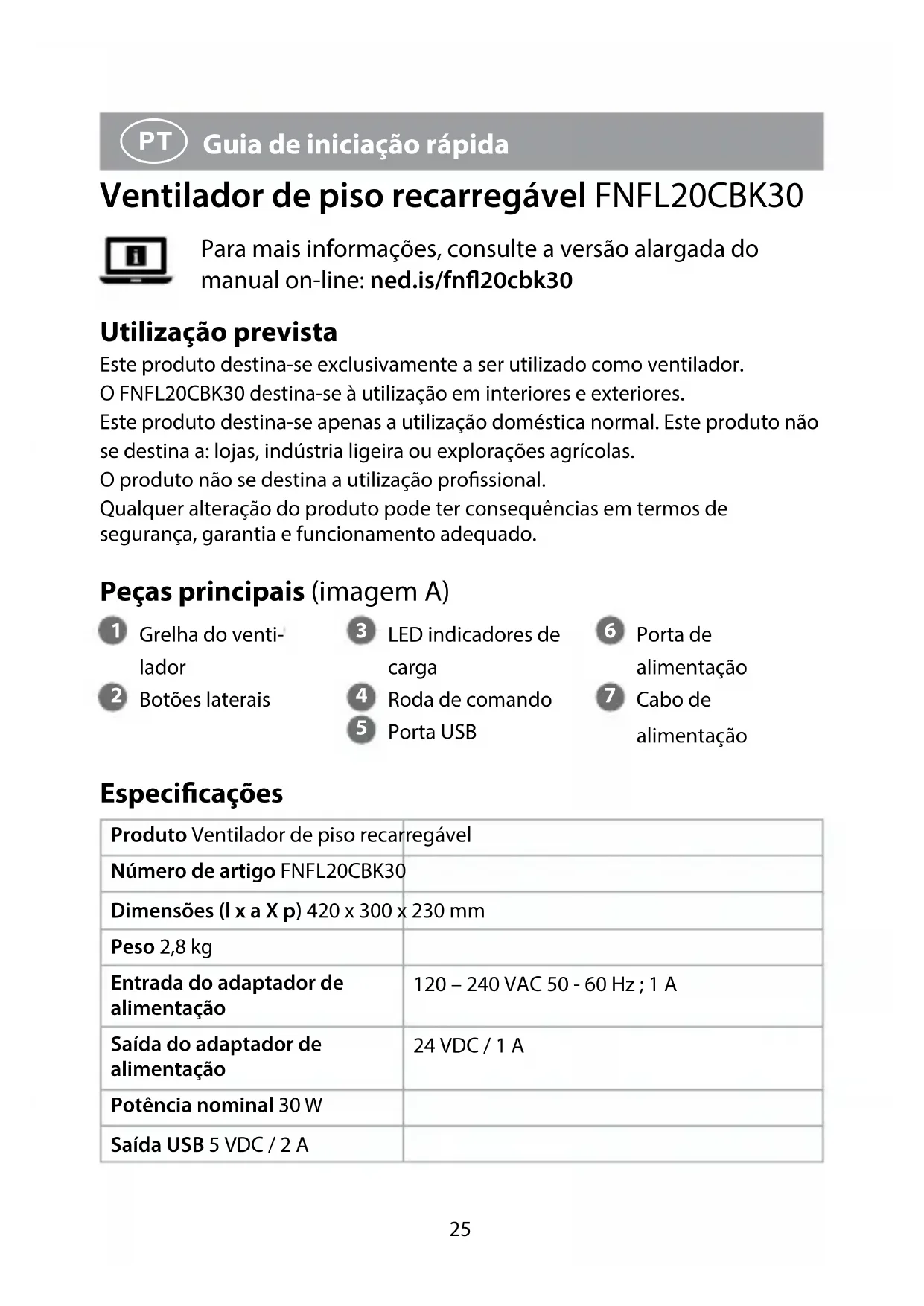 Guia de iniciação rápida Ventilador de piso recarregável FNFL20CBK30 Para mais informações, consulte a versão alargada do manual on-line: ned.is/fn20cbk30 Utilização prevista Este produto destina-se exclusivamente a ser utilizado como ventilador. O FNFL20CBK30 destina-se à utilização em interiores e exteriores. Este produto destina-se apenas a utilização doméstica normal. Este produto não se destina a: lojas, indústria ligeira ou explorações agrícolas. O produto não se destina a utilização prossional. Qualquer alteração do produto pode ter consequências em termos de segurança, garantia e funcionamento adequado. Peças principais (imagem A)