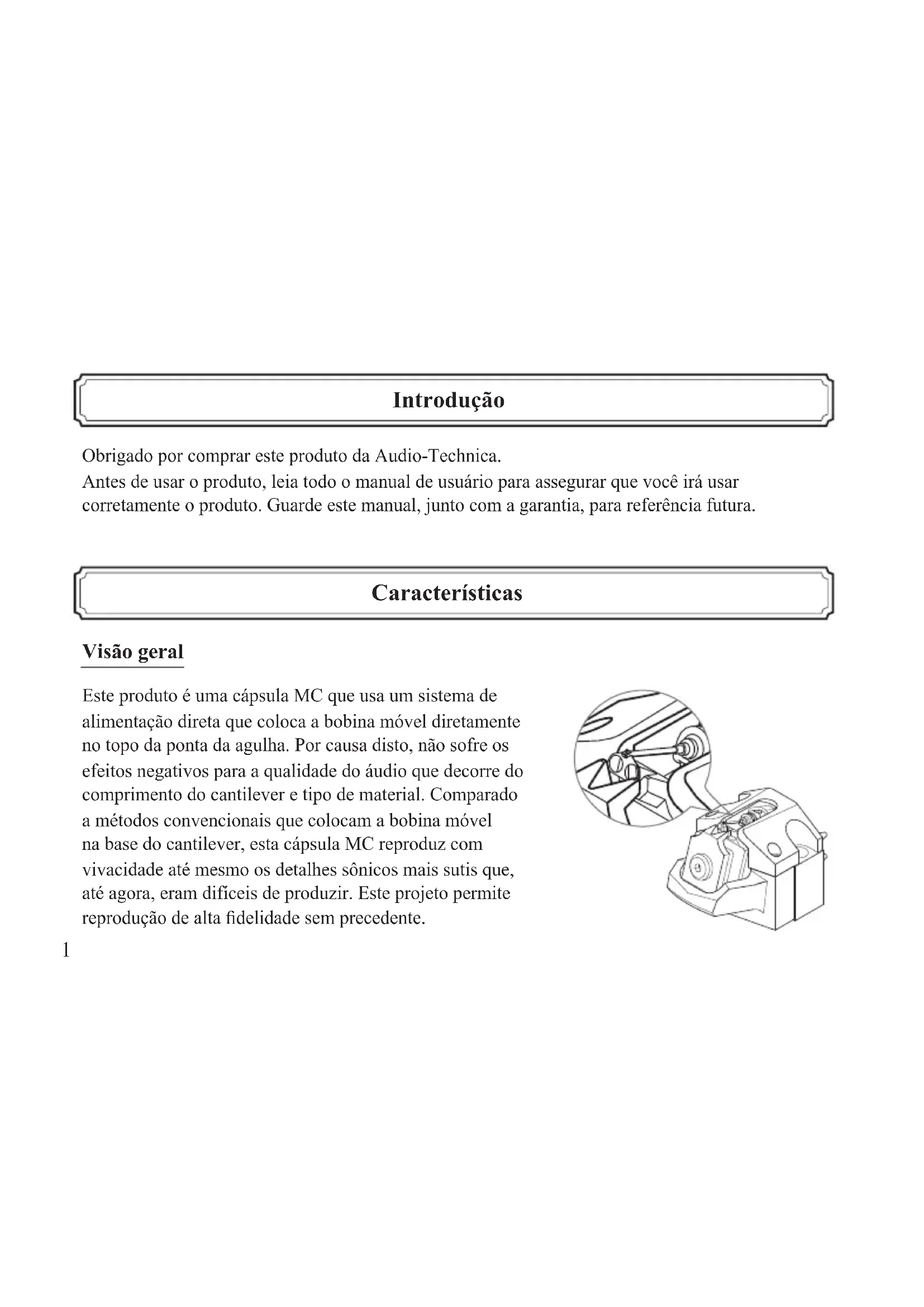 - Conjunto de cables conductores de PCOCC Especicaciones sujetas a cambio sin previo aviso debido a mejoras.1 Introdução Características Obrigado por comprar este produto da Audio-Technica. Antes de usar o produto, leia todo o manual de usuário para assegurar que você irá usar corretamente o produto. Guarde este manual, junto com a garantia, para referência futura. Visão geral Este produto é uma cápsula MC que usa um sistema de alimentação direta que coloca a bobina móvel diretamente no topo da ponta da agulha. Por causa disto, não sofre os efeitos negativos para a qualidade do áudio que decorre do comprimento do cantilever e tipo de material. Comparado a métodos convencionais que colocam a bobina móvel na base do cantilever, esta cápsula MC reproduz com vivacidade até mesmo os detalhes sônicos mais sutis que, até agora, eram difíceis de produzir. Este projeto permite reprodução de alta delidade sem precedente.2