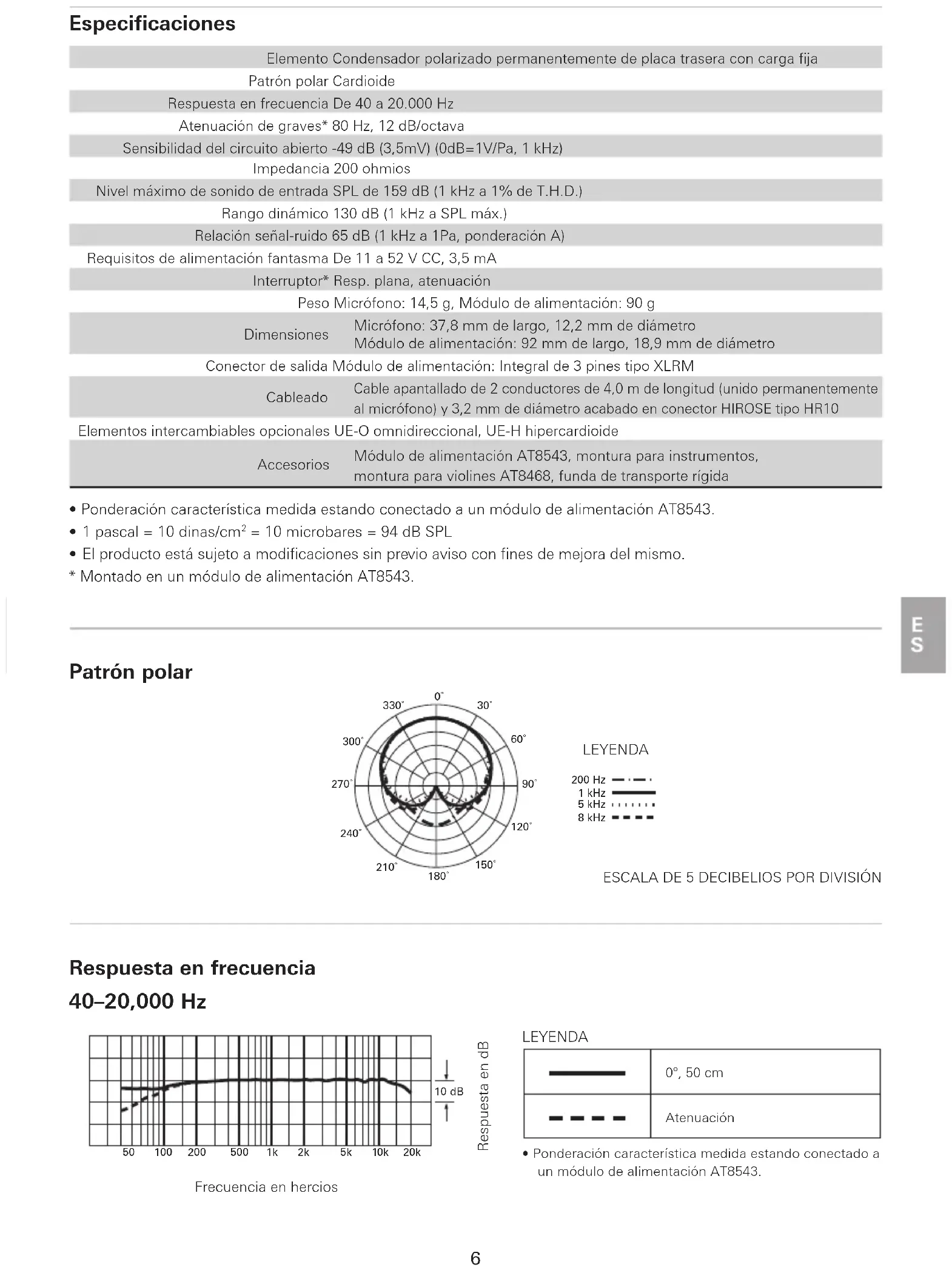 Especificações Elemento Placa traseira de carga fixa, condensador polarizado permanentemente Padrão polar Cardioide Resposta de frequência De 40 a 20.000 Hz Corte de baixa frequência* 80 Hz, 12 dB/oitava Sensibilidade em circuito aberto -49 dB (3,5mV) (0dB=1V/Pa, 1 kHz) Impedância 200 ohms Nível de som de entrada máximo 159 dB SPL (1 kHz em 1% THD) Faixa dinâmica 130 dB (1 kHz em SPL máximo) Relação sinal-ruído 65 dB (1 kHz em 1Pa, de ponderação A) Requisitos de alimentação fantasma 11V a 52V DC, 3,5 mA Interruptor* Plano, Corte Peso Microfone: 14,5 g, módulo de alimentação: 90 g Dimensões Microfone: 37,8 mm de comprimento, 12,2 mm de diâmetro Módulo de alimentação: 92 mm de comprimento, 18,9 mm de diâmetro Conector de saída Módulo de alimentação: Integral de 3 pinos do tipo XLRM Cabo(s) 4 m de comprimento (conectado permanentemente ao microfone), 3,2 mm de diâmetro, cabo blindado bicondutor com conector tipo HIROSE HR10 Elementos intercambiáveis opcionais UE-O omnidirecional, UE-H hipercardioide Acessórios Módulo de alimentação AT8543, montagem de instrumento para microfone, montagem violino AT8468, bolsa de transporte rígida