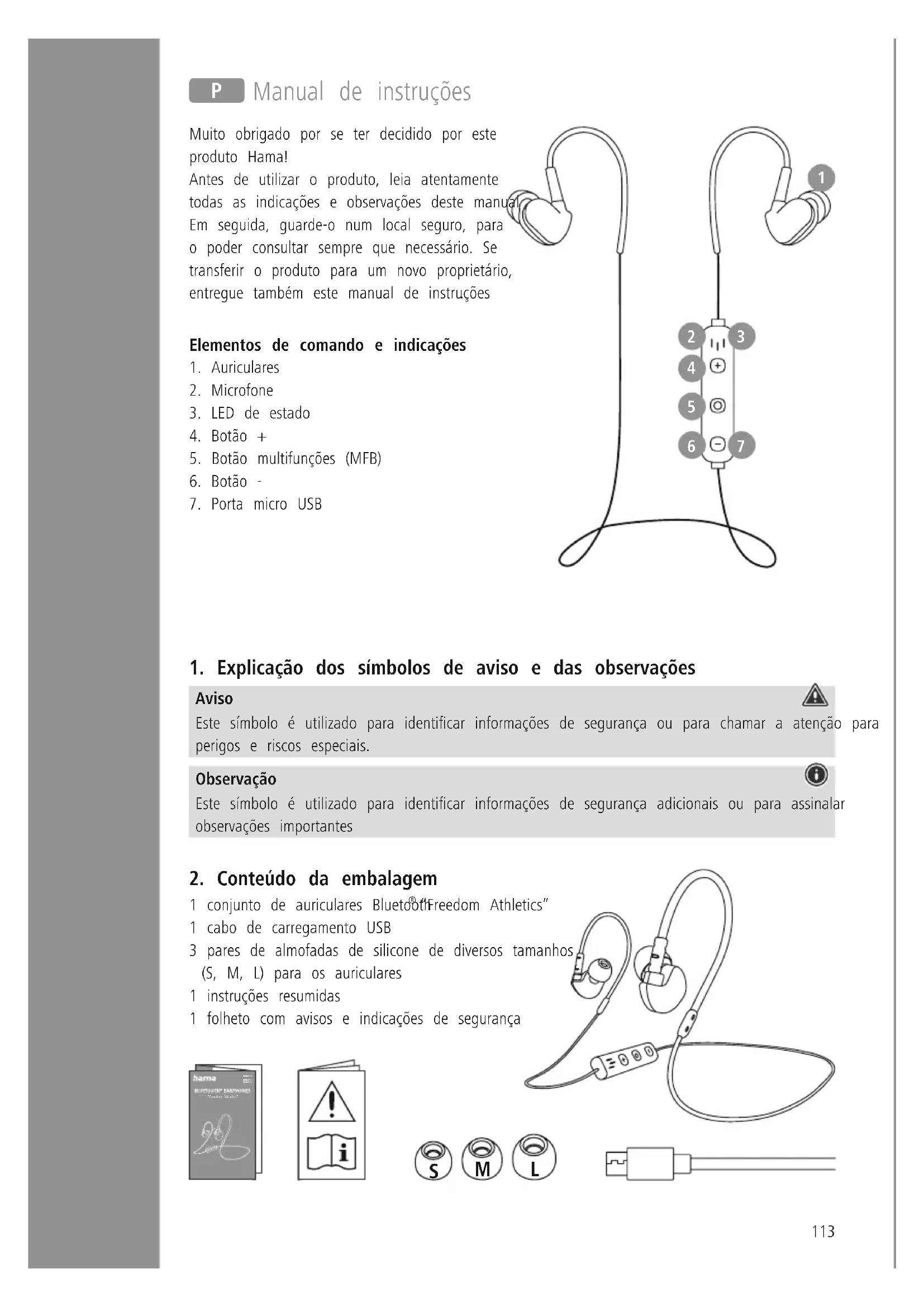 “Freedom Athletics” 1 cabo de carregamento USB 3 pares de almofadas de silicone de diversos tamanhos (S, M, L) para os auriculares 1 instruções resumidas 1 folheto com avisos e indicações de segurança 001841180018411900184120“Freedom Athletics”