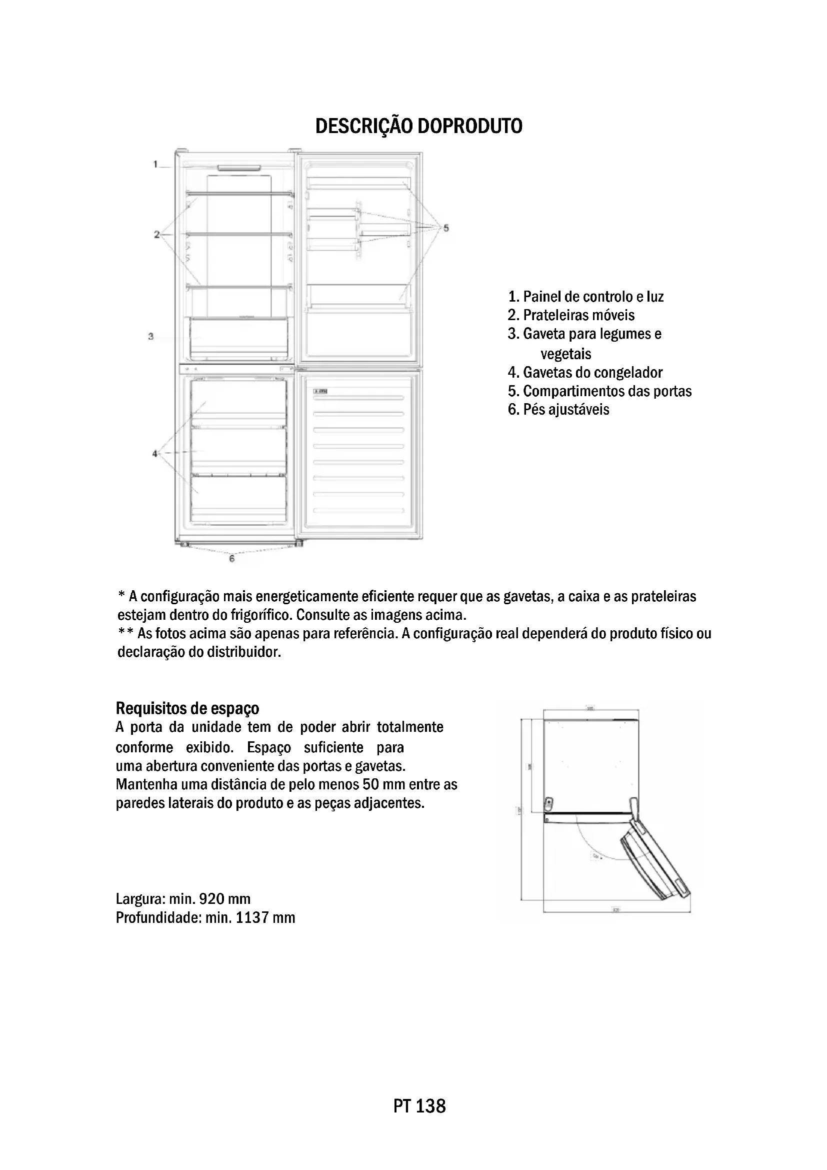 - A configuração mais energeticamente eficiente requer que as gavetas, a caixa e as prateleiras estejam dentro do frigorífico. Consulte as imagens acima. ** As fotos acima são apenas para referência. A configuração real dependerá do produto físico ou declaração do distribuidor. Requisitos de espaço A porta da unidade tem de poder abrir totalmente conforme exibido. Espaço suficiente para uma abertura conveniente das portas e gavetas. Mantenha uma distância de pelo menos 50 mm entre as paredes laterais do produto e as peças adjacentes. Largura: min. 920 mm Profundidade: min. 1137 mmPT 139 UTILIZAÇÃO ➀ Tecla ON/OFF, utilizada para ligar/desligar o aparelho.. ➁ Tecla SET, utilizada para selecionar a temperatura do frigorífico ou as funções especiais como. ➂ O ícone Wi-Fi mostra se o aparelho está conectado à aplicação. ➃ Ícone Super Cool, mostra se a função está ativada. ➄ Os níveis de temperatura, mostram qual é a temperatura selecionada. Utilização