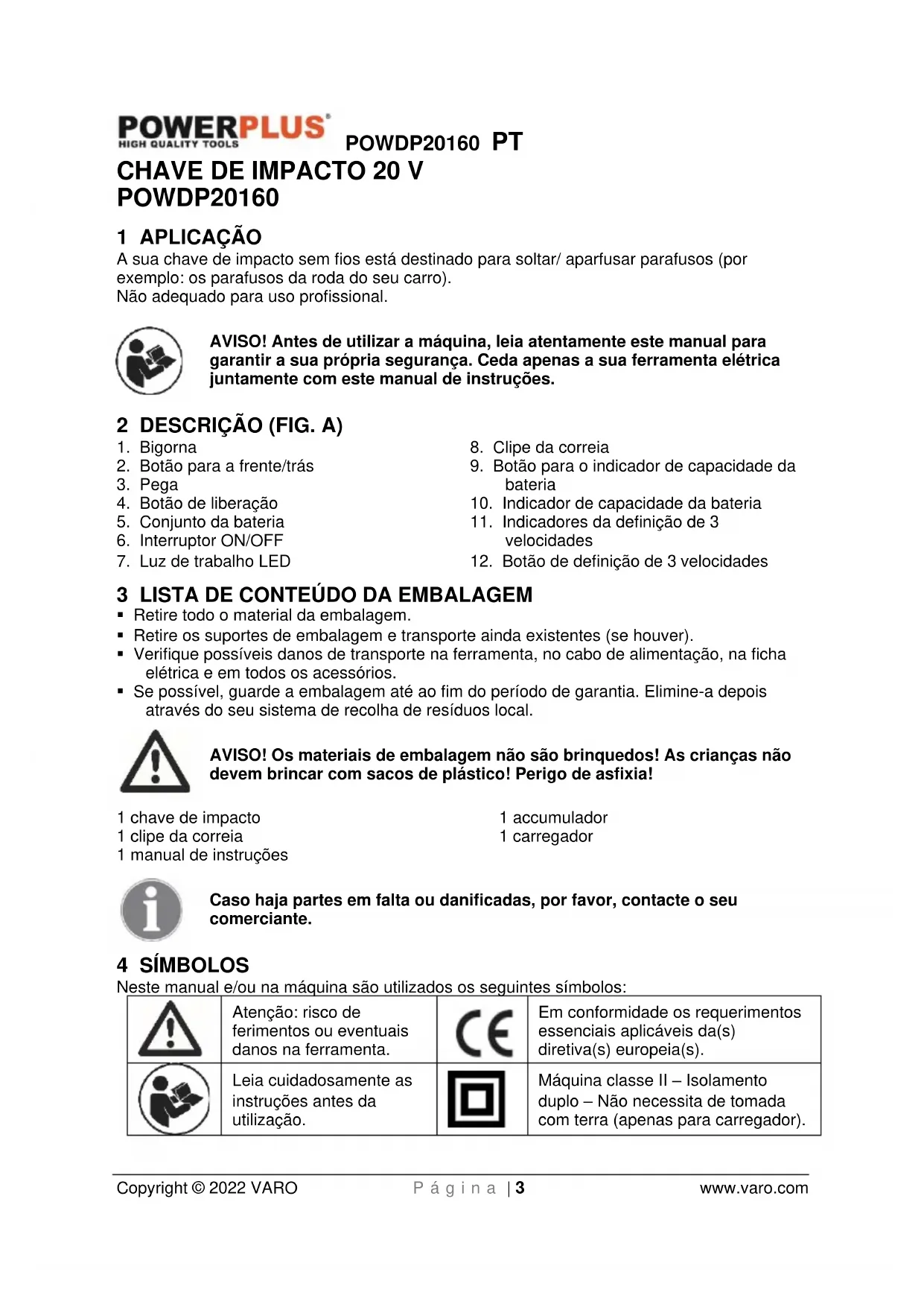 Máquina classe II – Isolamento duplo – Não necessita de tomada com terra (apenas para carregador).POWDP20160 PT Copyright © 2022 VARO P á g i n a | 4 www.varo.com