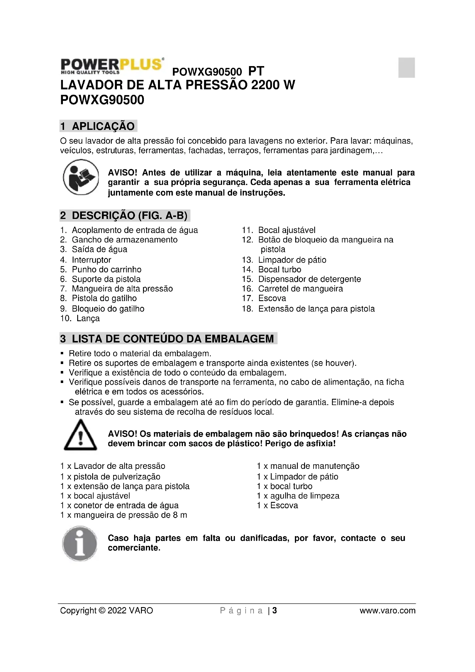 AVISO! Os materiais de embalagem não são brinquedos! As crianças não devem brincar com sacos de plácico! Perigo de asfixia!