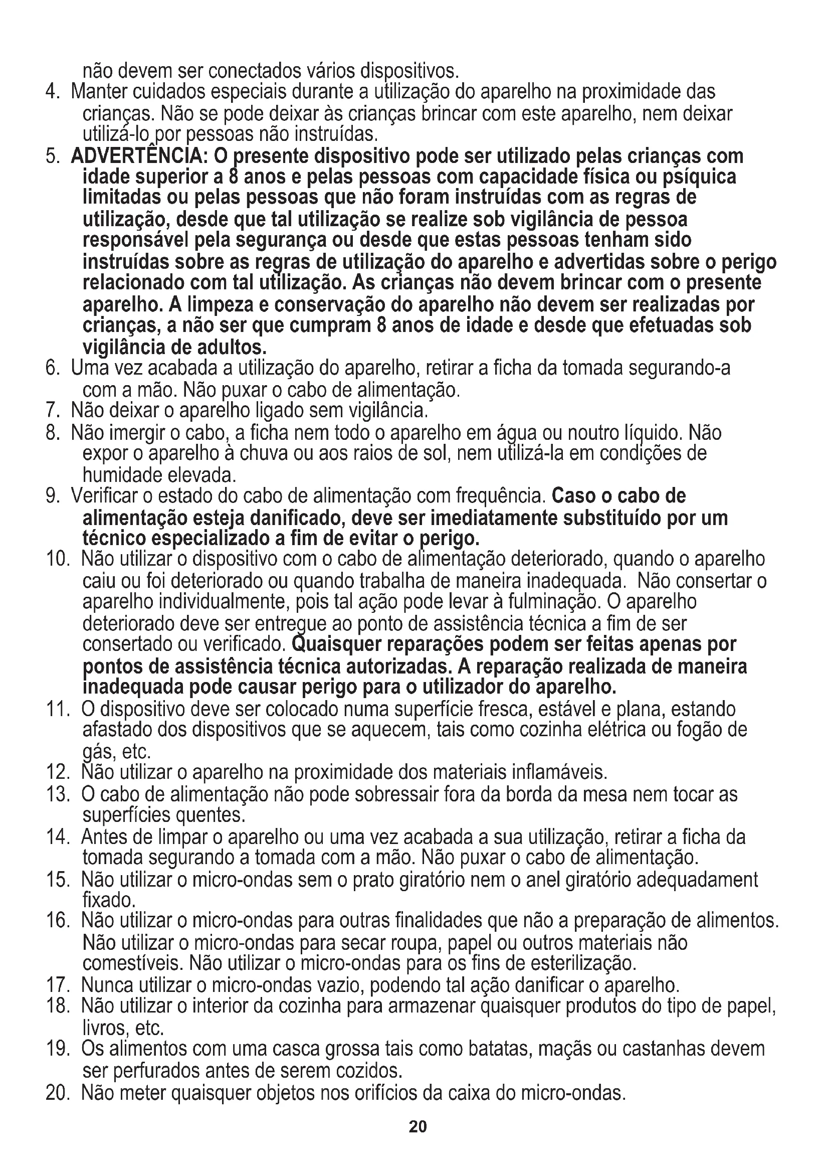 20. Não meter quaisquer objetos nos orifícios da caixa do micro-ondas.