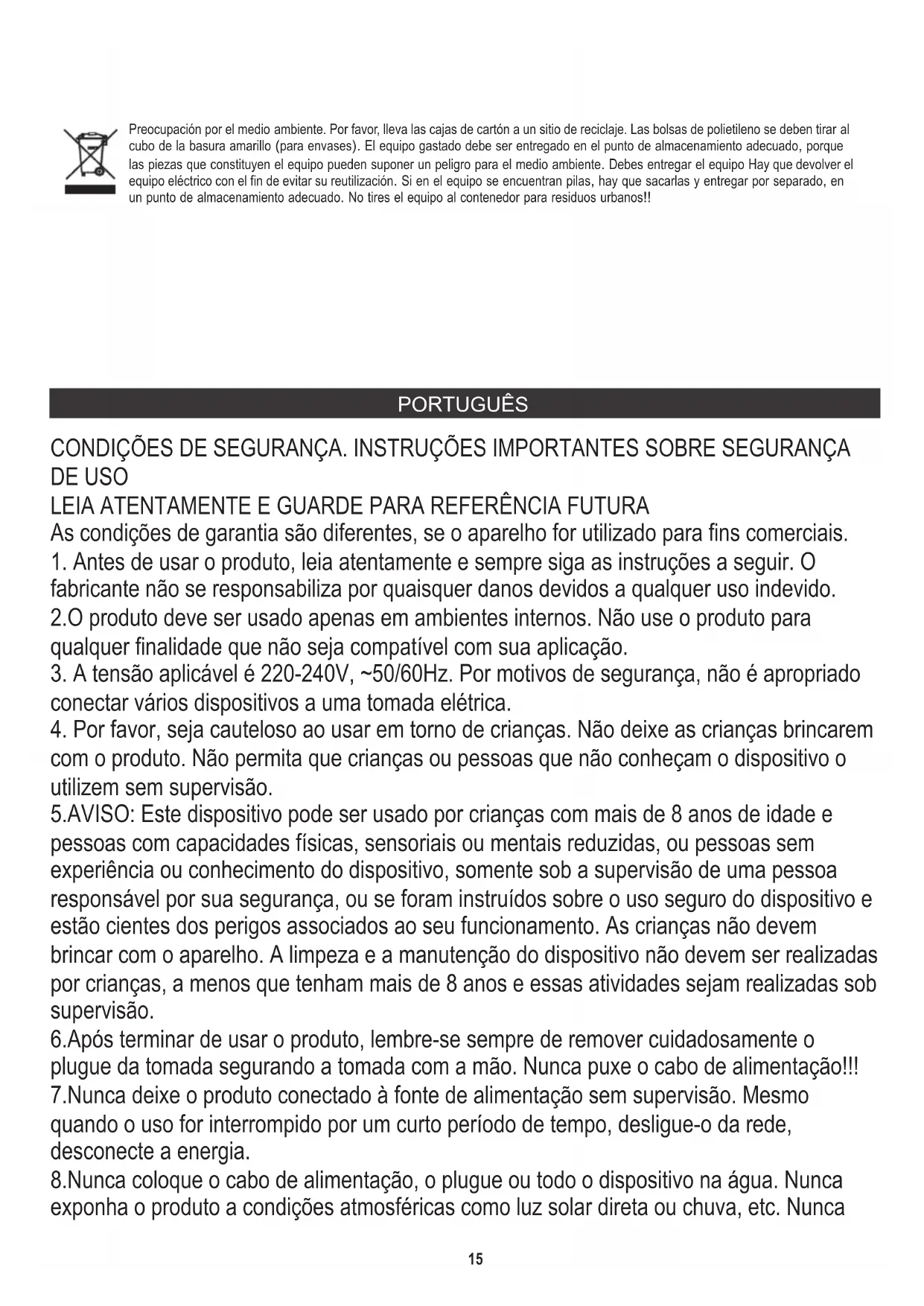 com o produto. Não permita que crianças ou pessoas que não conheçam o dispositivo o utilizem sem supervisão. 8.Nunca coloque o cabo de alimentação, o plugue ou todo o dispositivo na água. Nunca exponha o produto a condições atmosféricas como luz solar direta ou chuva, etc. Nunca As condições de garantia são diferentes, se o aparelho for utilizado para fins comerciais.