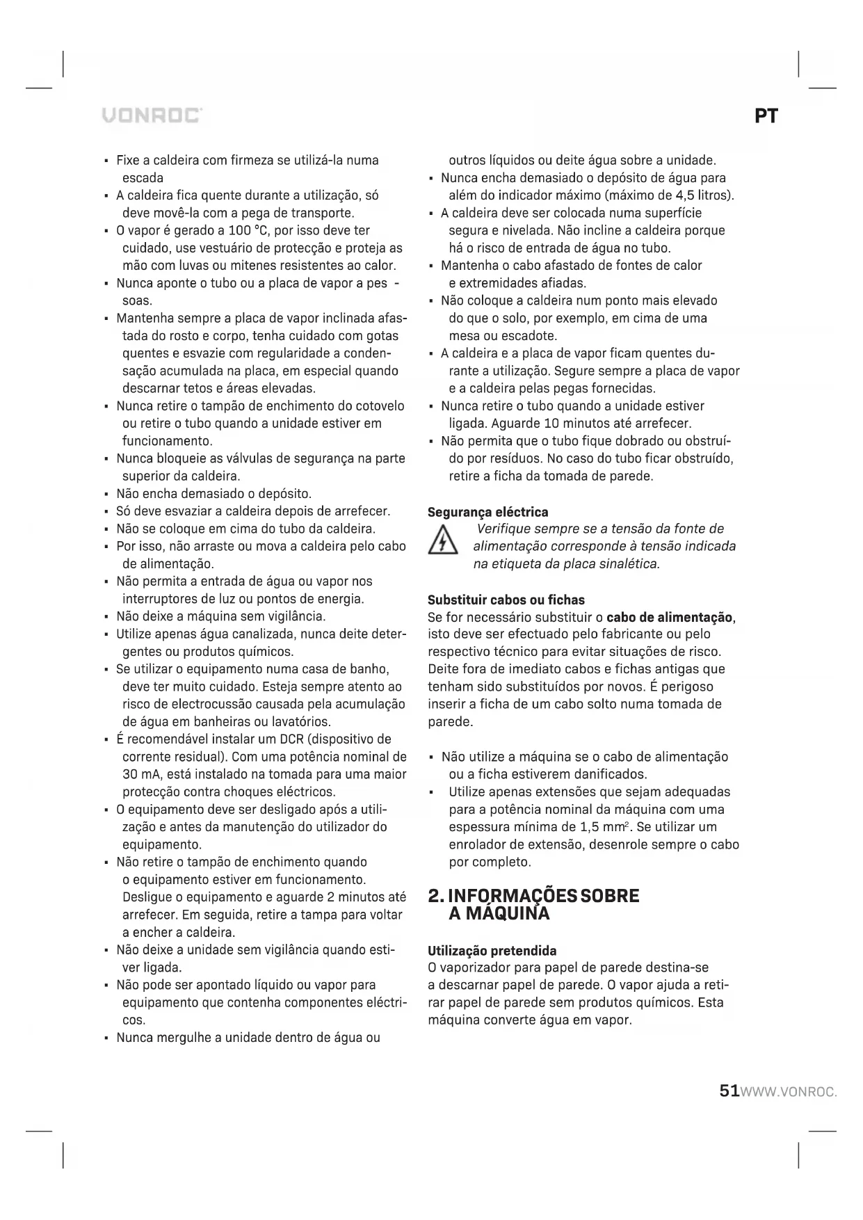 Aunidade não ferve aágua É provável que não deixado aunidade aarrefecer durante tempo suficiente, consulte asecção sobre ofusível. Verifique se ofusível na ficha está em boas condições ecom uma potência nominal de 13 amperes. Se utilizar uma extensão, verifique se tem uma potência nominal mínima de 10 amperes eestá totalmente desenrolada. Há fuga de vapor na válvula de libertação de pressão Aválvula de libertação de pressão é uma válvula de pressão reduzida especial enão pode ser subs- tituída por qualquer outra válvula. Se houver fuga de vapor da válvula, acausa mais provável é uma obstrução no tubo. Aguarde até otubo arrefecer, retire otubo everifique se existe alguma obstru- ção. Verifique sempre aentrada na ferramenta que está autilizar. Não deve, em nenhuma circunstância, forçar ofecho da válvula. Isto serve para protegê-lo. AMBIENTE Os equipamentos eléctricos ou electrónicos defeituosos e/ou eliminados devem ser recolhidos em locais de reciclagem adequados. Apenas para os países da CE Não elimine as ferramentas eléctricas em conjun- to com os resíduos domésticos. De acordo com adirectiva europeia 2012/19/UE sobre resíduos de equipamentos eléctricos eelectrónicos eares- pectiva implementação na legislação nacional, as ferramentas eléctricas que já não sejam utilizadas devem ser recolhidas em separado eeliminadas de maneira ecológica. GARANTIA Os produtos da VONROC são desenvolvidos de acordo com os padrões de qualidade mais ele- vados enão apresentam quaisquer defeitos em termos de materiais emão-de-obra em relação ao período estipulado por lei, cujo início é apartir da data de compra original. Se oproduto apresentar qualquer falha durante este período devido aqual- quer defeito no material e/ou de mão-de-obra, contacte aVONROC directamente. As seguintes circunstâncias estão excluídas desta garantia: