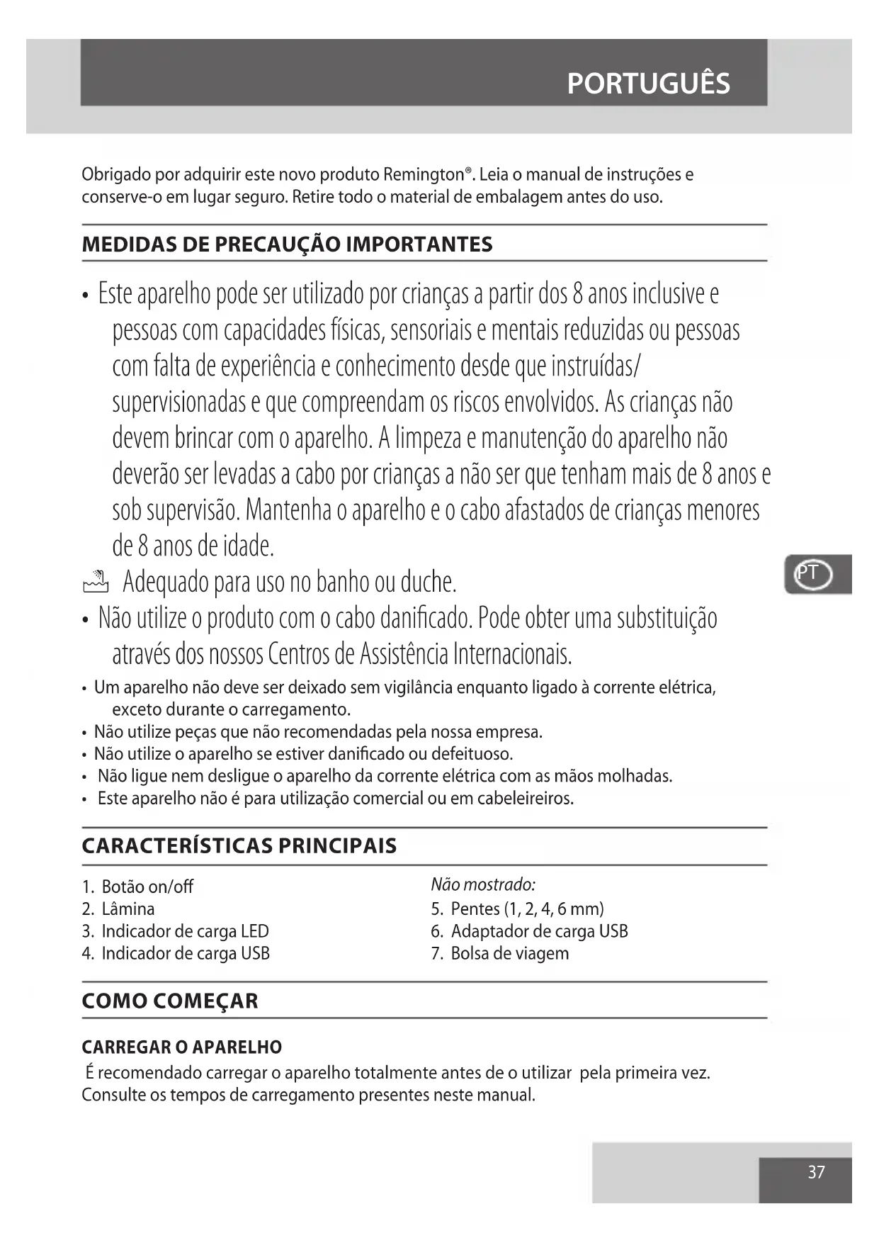 1. Botão on/o2. Lâmina3. Indicador de carga LED4. Indicador de carga USBNão mostrado:5. Pentes (1, 2, 4, 6 mm) 6. Adaptador de carga USB7. Bolsa de viagem
