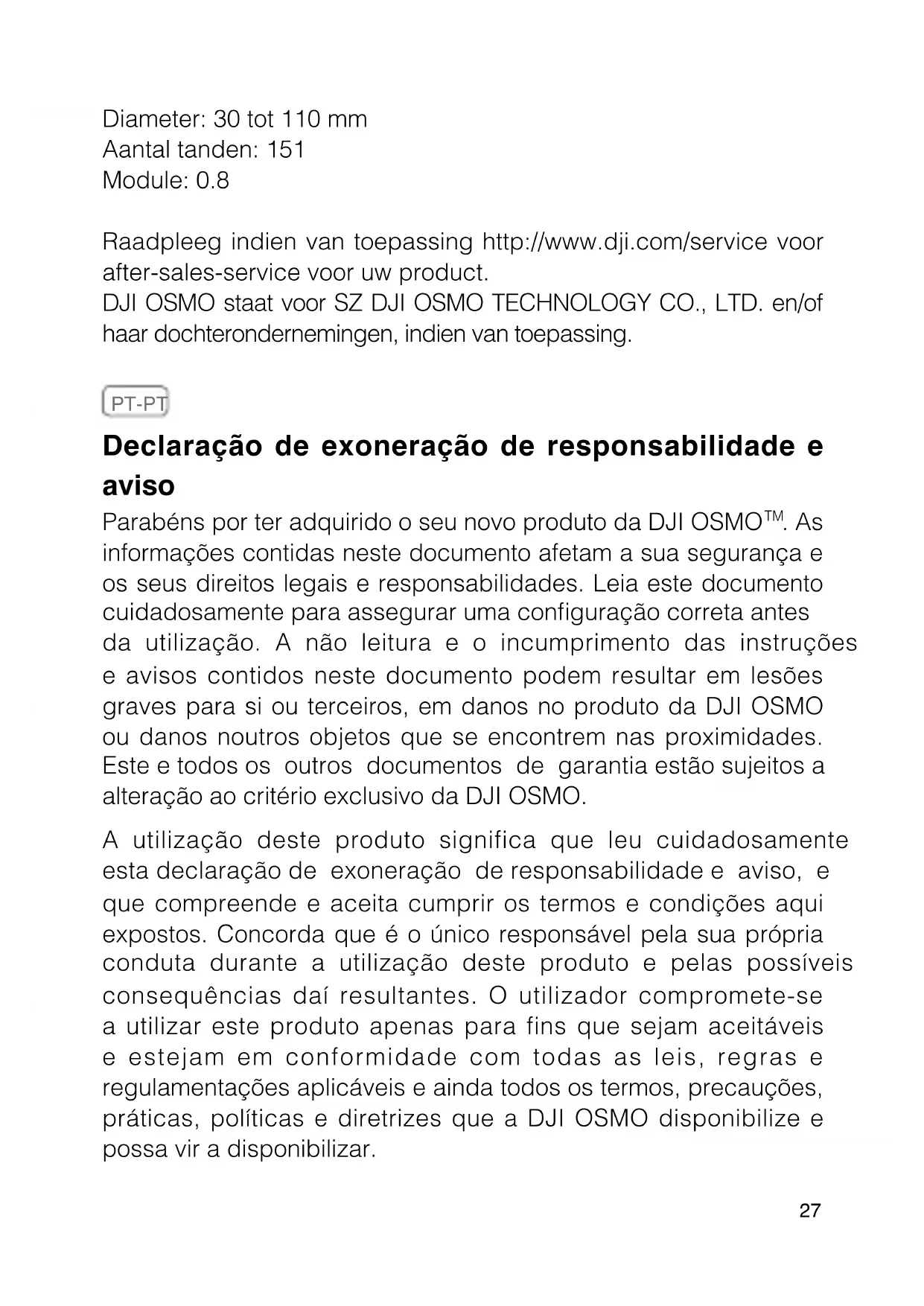 base superior para o xar à câmara. Para desapertar a tira de engrenagem, empurre a tira engrenagem para fora enquanto segura firmemente o suporte da correia. NÃO puxe a tira da engrenagem de forma forçada ou a tira da engrenagem será danicada. Corte a Faixa de Engrenagem de Focagem para o comprimento necessário, deixando o suciente para ajustes (se necessário). Especicação Comprimento: 377 mm Diâmetro: 30 a 110 mm N.º de dentes: 151 Módulo: 0.8 Suporte da correia30 Consulte http://www.dji.com/service para obter assistência pós- venda para o seu produto, conforme aplicável. DJI OSMO signica SZ DJI OSMO TECHNOLOGY CO., LTD. e/ou as suas empresas aliadas, conforme aplicável. PT-BR Isenção de responsabilidade e aviso Parabéns por ter adquirido o seu novo produto DJI OSMO