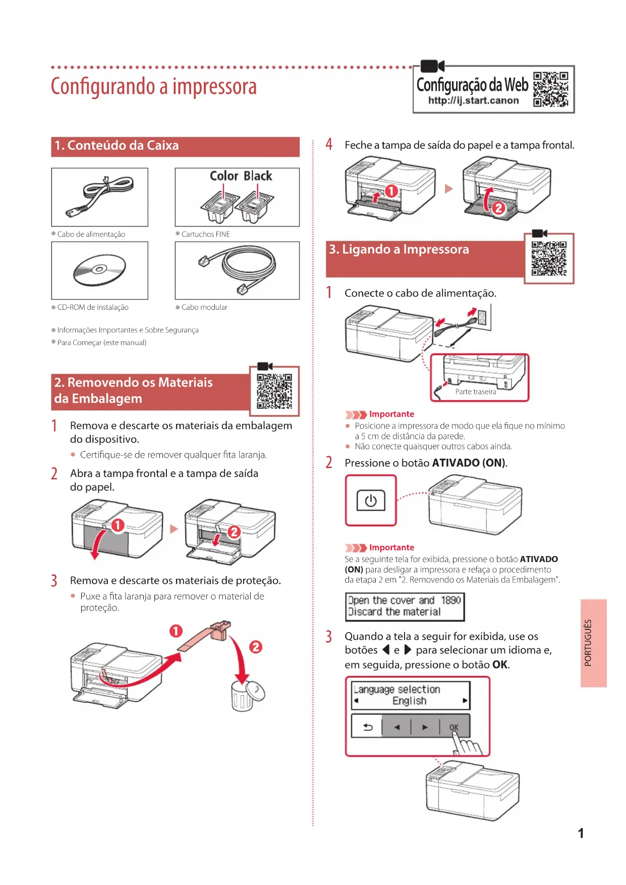 Conecte o cabo de alimentação. Parte traseira Importante Posicione a impressora de modo que ela que no mínimo a5 cm de distância da parede. Não conecte quaisquer outros cabos ainda. Pressione o botão ATIVADO (ON). ImportanteSe a seguinte tela for exibida, pressione o botão ATIVADO (ON) para desligar a impressora e refaça o procedimento daetapa 2 em "2. Removendo os Materiais daEmbalagem". Quando a tela a seguir for exibida, use os botões [ e ] para selecionar um idioma e, emseguida, pressione o botão OK. Congurando a impressora Conguração da Web2 Congurando a impressora