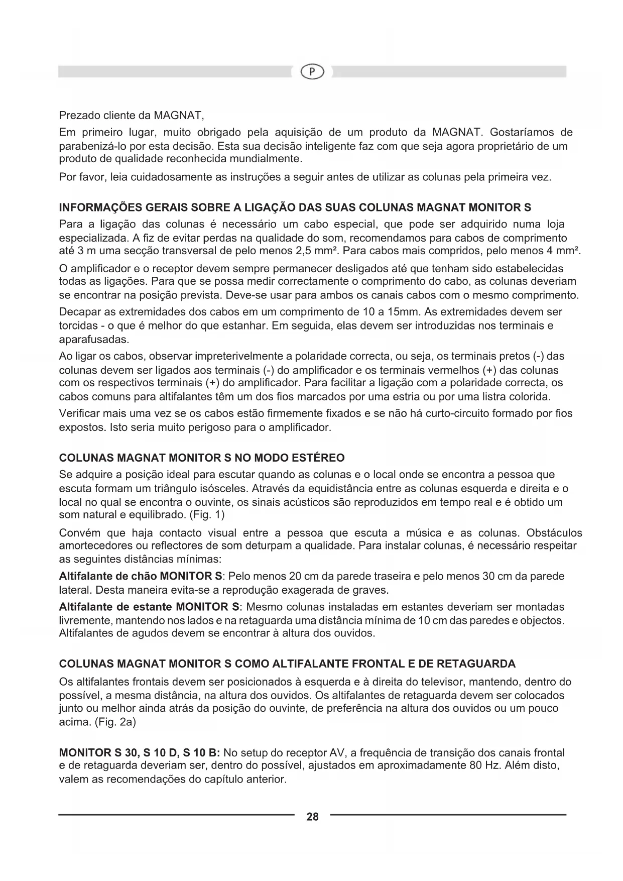 Conguración: 2 vías “dipolo” 2 vías Resistencia: 60 / 120 vatios 60 / 120 vatios Impedancia: 4 – 8 ohmios 4 – 8 ohmios Gama de frecuencias: 42 – 32 000 Hz 42 – 32 000 Hz Potencia recomendada del amplicador: 20 – 120 vatios 20 – 120 vatios Rendimiento (2.8V/1m): 88 dB 88 dB Dimensiones (ANxALxPR): 149 x 250 x 130 mm 149 x 250 x 190 mm Accesorios: Pies de goma Pies de goma Reservados los derechos de realizar cambios técnicos.28 Prezado cliente da MAGNAT, Em primeiro lugar, muito obrigado pela aquisição de um produto da MAGNAT. Gostaríamos de parabenizá-lo por esta decisão. Esta sua decisão inteligente faz com que seja agora proprietário de um produto de qualidade reconhecida mundialmente. Por favor, leia cuidadosamente as instruções a seguir antes de utilizar as colunas pela primeira vez. INFORMAÇÕES GERAIS SOBRE A LIGAÇÃO DAS SUAS COLUNAS MAGNAT MONITOR S Para a ligação das colunas é necessário um cabo especial, que pode ser adquirido numa loja especializada. A z de evitar perdas na qualidade do som, recomendamos para cabos de comprimento até 3 m uma secção transversal de pelo menos 2,5 mm². Para cabos mais compridos, pelo menos 4 mm². O amplicador e o receptor devem sempre permanecer desligados até que tenham sido estabelecidas todas as ligações. Para que se possa medir correctamente o comprimento do cabo, as colunas deveriam se encontrar na posição prevista. Deve-se usar para ambos os canais cabos com o mesmo comprimento. Decapar as extremidades dos cabos em um comprimento de 10 a 15mm. As extremidades devem ser torcidas - o que é melhor do que estanhar. Em seguida, elas devem ser introduzidas nos terminais e aparafusadas. Ao ligar os cabos, observar impreterivelmente a polaridade correcta, ou seja, os terminais pretos (-) das colunas devem ser ligados aos terminais (-) do amplicador e os terminais vermelhos (+) das colunas com os respectivos terminais (+) do amplicador. Para facilitar a ligação com a polaridade correcta, os cabos comuns para altifalantes têm um dos os marcados por uma estria ou por uma listra colorida. Vericar mais uma vez se os cabos estão rmemente xados e se não há curto-circuito formado por os expostos. Isto seria muito perigoso para o amplicador. COLUNAS MAGNAT MONITOR S NO MODO ESTÉREO Se adquire a posição ideal para escutar quando as colunas e o local onde se encontra a pessoa que escuta formam um triângulo isósceles. Através da equidistância entre as colunas esquerda e direita e o local no qual se encontra o ouvinte, os sinais acústicos são reproduzidos em tempo real e é obtido um som natural e equilibrado. (Fig. 1) Convém que haja contacto visual entre a pessoa que escuta a música e as colunas. Obstáculos amortecedores ou reectores de som deturpam a qualidade. Para instalar colunas, é necessário respeitar as seguintes distâncias mínimas: Altifalante de chão MONITOR S: Pelo menos 20 cm da parede traseira e pelo menos 30 cm da parede lateral. Desta maneira evita-se a reprodução exagerada de graves. Altifalante de estante MONITOR S: Mesmo colunas instaladas em estantes deveriam ser montadas livremente, mantendo nos lados e na retaguarda uma distância mínima de 10 cm das paredes e objectos. Altifalantes de agudos devem se encontrar à altura dos ouvidos. COLUNAS MAGNAT MONITOR S COMO ALTIFALANTE FRONTAL E DE RETAGUARDA Os altifalantes frontais devem ser posicionados à esquerda e à direita do televisor, mantendo, dentro do possível, a mesma distância, na altura dos ouvidos. Os altifalantes de retaguarda devem ser colocados junto ou melhor ainda atrás da posição do ouvinte, de preferência na altura dos ouvidos ou um pouco acima. (Fig. 2a) MONITOR S 30, S 10 D, S 10 B: No setup do receptor AV, a frequência de transição dos canais frontal e de retaguarda deveriam ser, dentro do possível, ajustados em aproximadamente 80 Hz. Além disto, valem as recomendações do capítulo anterior.29