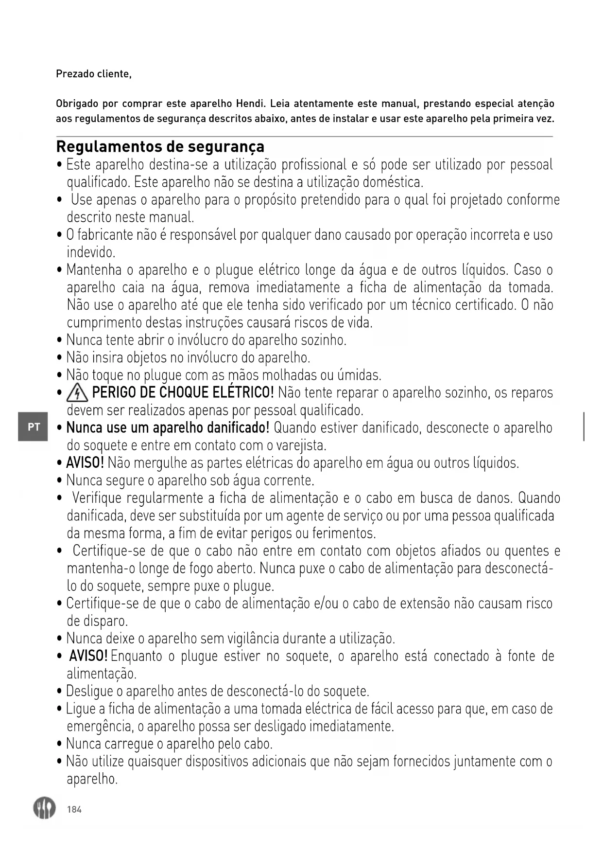 Prezado cliente, Obrigado por comprar este aparelho Hendi. Leia atentamente este manual, prestando especial atenção aos regulamentos de segurança descritos abaixo, antes de instalar e usar este aparelho pela primeira vez. Regulamentos de segurança