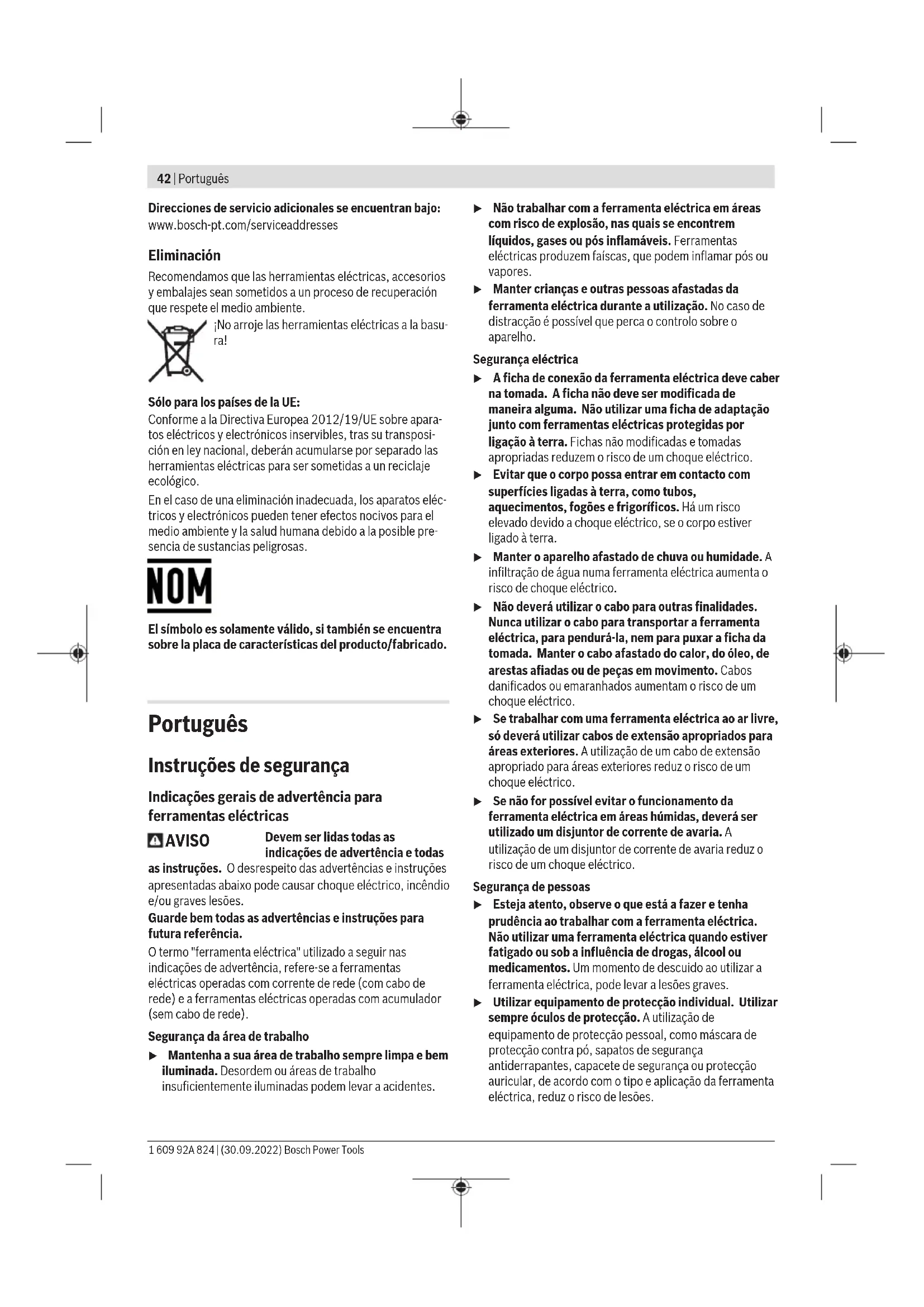 - HF42 HF43 Potência nominal absorvida W 2000 2000 2200 2200 2400 2400 Rotações nominais r.p.m. 6500 6500 6500 6500 6500 6500 Diâmetro máx. dos discos de rebarbar mm 230 230 230 230 230 230 Rosca do veio de retificação M14 M14 M14 M14 M14 M14 Comprimento máx. da rosca do veio de retificação mm 25 25 25 25 25 25 Proteção contra rearranque involuntário ● – ● – ● – Arranque suave ● – ● – ● – Peso conforme EPTA‑Procedure01:2014 – com punho adicional com kg 5,2 5,1 5,5 5,4 5,5 5,4 1 609 92A 824 | (30.09.2022) Bosch Power ToolsPortuguês | 47 Rebarbadora GWS2000J GWS2000P GWS2200J GWS2200P GWS2400J GWS2400P amortecimento das vibrações – com punho adicional padrão kg 5,1 5,0 5,4 5,3 5,4 5,3 Classe de proteção /II /II /II /II /II /II Os dados aplicam-se a uma tensão nominal [U] de 230 V. Com tensões divergentes e em versões específicas do país, estes dados podem variar. Indicações relativas às condições de ligação à rede paraGWS2000P/GWS2200P/GWS2400P: O aparelho cumpre aos requisitos IEC 61000-3-11 e está sujeito a conexão condicional. O aparelho pode causar flutuações ocasionais de voltagem sob condições de energia desfavoráveis. A impedância deste aparelho está definida como Z atual =0,18Ω. O utilizador tem de assegurar que o ponto de conexão, com a impedância Z máx. , onde o aparelho deve ser conectado cumpre o requisito de impedância: Z atual p. 3601