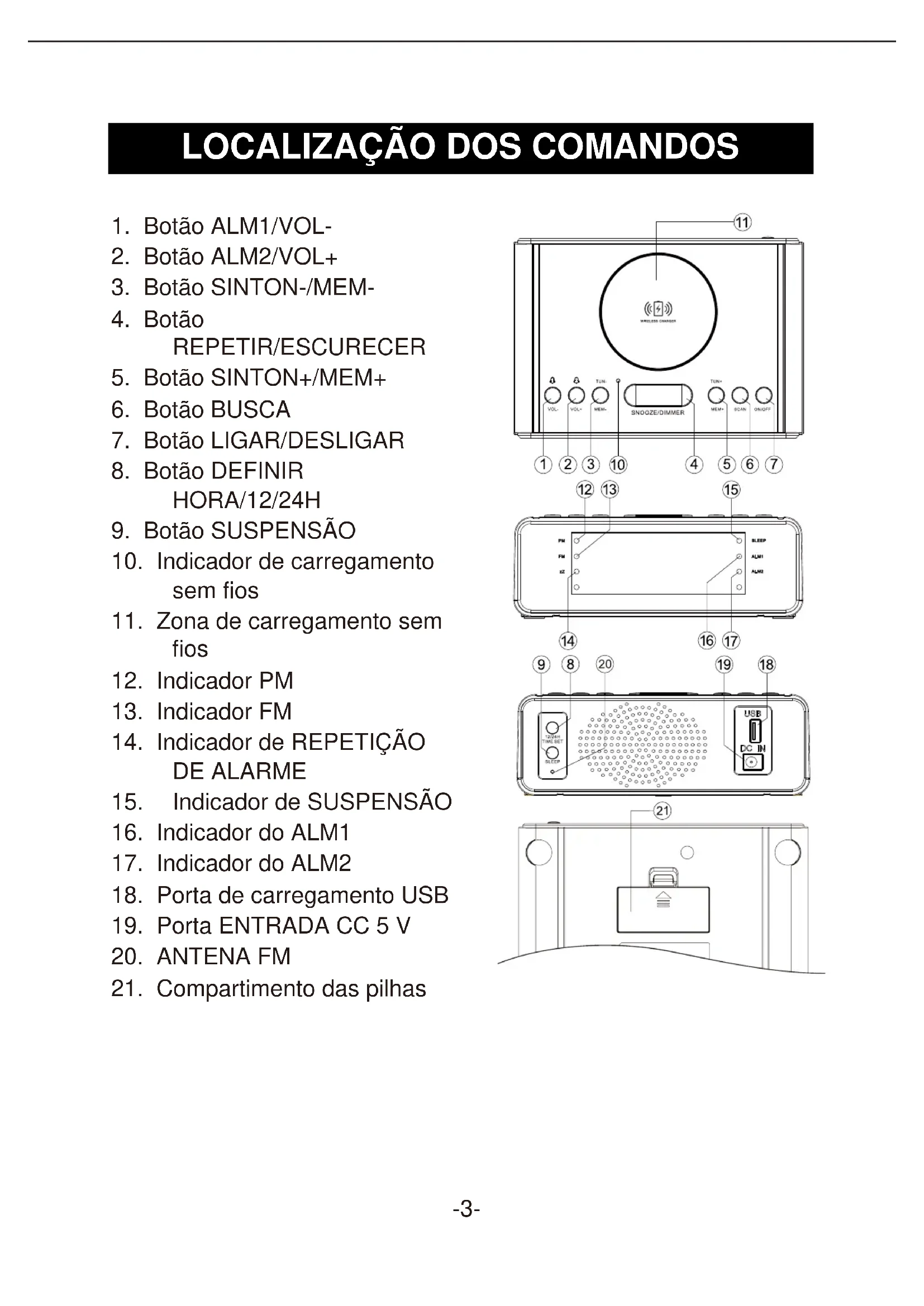 No modo FM, premir o botão ⑨ para選擇ar 120-90-60-45-30-15-DESLIGADO para o modo de suspensão. Selecione DESLIGADO para a unidade regressar ao modo de espera (relógio).