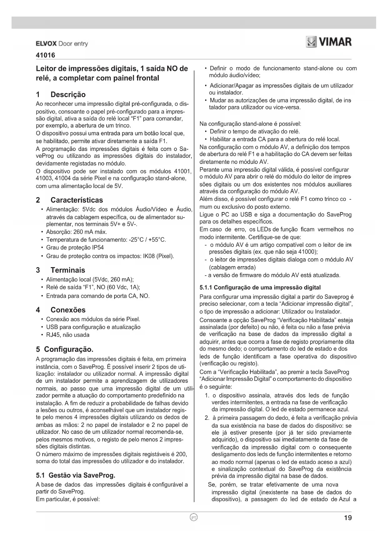 ELVOX 41016 - Leitor de impressões digitais Vimar - Manual de utilização gratuito