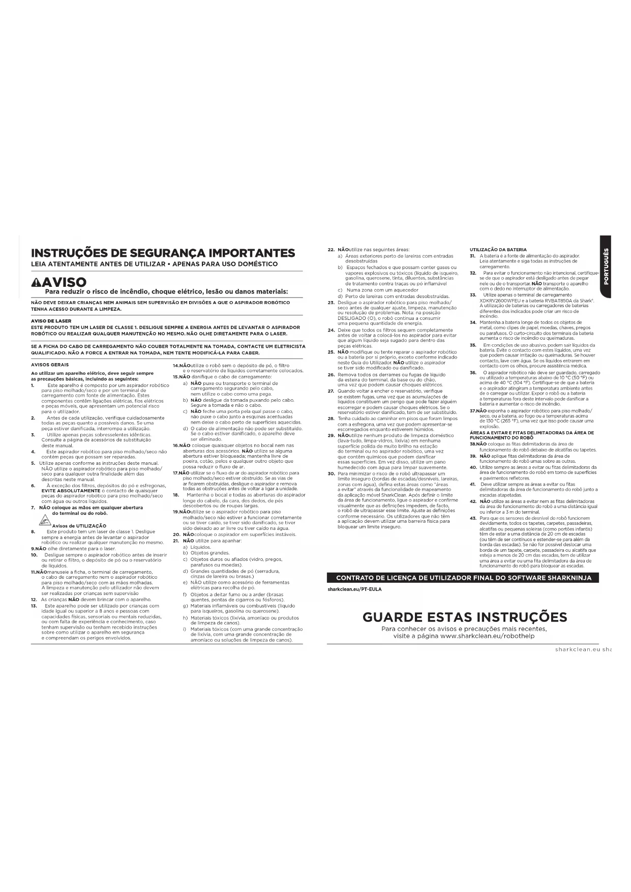 LEIA ATENTAMENTE ANTES DE UTILIZAR • APENAS PARA USO DOMÉSTICO AVISOS GERAISAo utilizar um aparelho elétrico, deve seguir sempre as precauções básicas, incluindo as seguintes:1. Este aparelho é composto por um aspirador robótico para piso molhado/seco e por um terminal de carregamento com fonte de alimentação. Estes componentes contêm ligações elétricas, fios elétricos e peças móveis, que apresentam um potencial risco para o utilizador.2. Antes de cada utilização, verifique cuidadosamente todas as peças quanto a possíveis danos. Se uma peça estiver danificada, interrompa a utilização.3. Utilize apenas peças sobresselentes idênticas. Consulte a página de acessórios de substituição deste manual.4. Este aspirador robótico para piso molhado/seco não contém peças que possam ser reparadas.5. Utilize apenas conforme as instruções deste manual. NÃO utilize o aspirador robótico para piso molhado/seco para qualquer outra finalidade além das descritas neste manual.6. À exceção dos filtros, depósitos do pó e esfregonas, EVITE ABSOLUTAMENTE o contacto de quaisquer peças do aspirador robótico para piso molhado/seco com água ou outros líquidos.7. NÃO coloque as mãos em qualquer abertura do terminal ou do robô.Avisos de UTILIZAÇÃO8. Este produto tem um laser de classe 1. Desligue sempre a energia antes de levantar o aspirador robótico ou realizar qualquer manutenção no mesmo.9. NÃO olhe diretamente para o laser. 10. Desligue sempre o aspirador robótico antes de inserir ou retirar o filtro, o depósito de pó ou o reservatório de líquidos.11. NÃO manuseie a ficha, o terminal de carregamento, o cabo de carregamento nem o aspirador robótico para piso molhado/seco com as mãos molhadas. A limpeza e manutenção pelo utilizador não devem ser realizadas por crianças sem supervisão