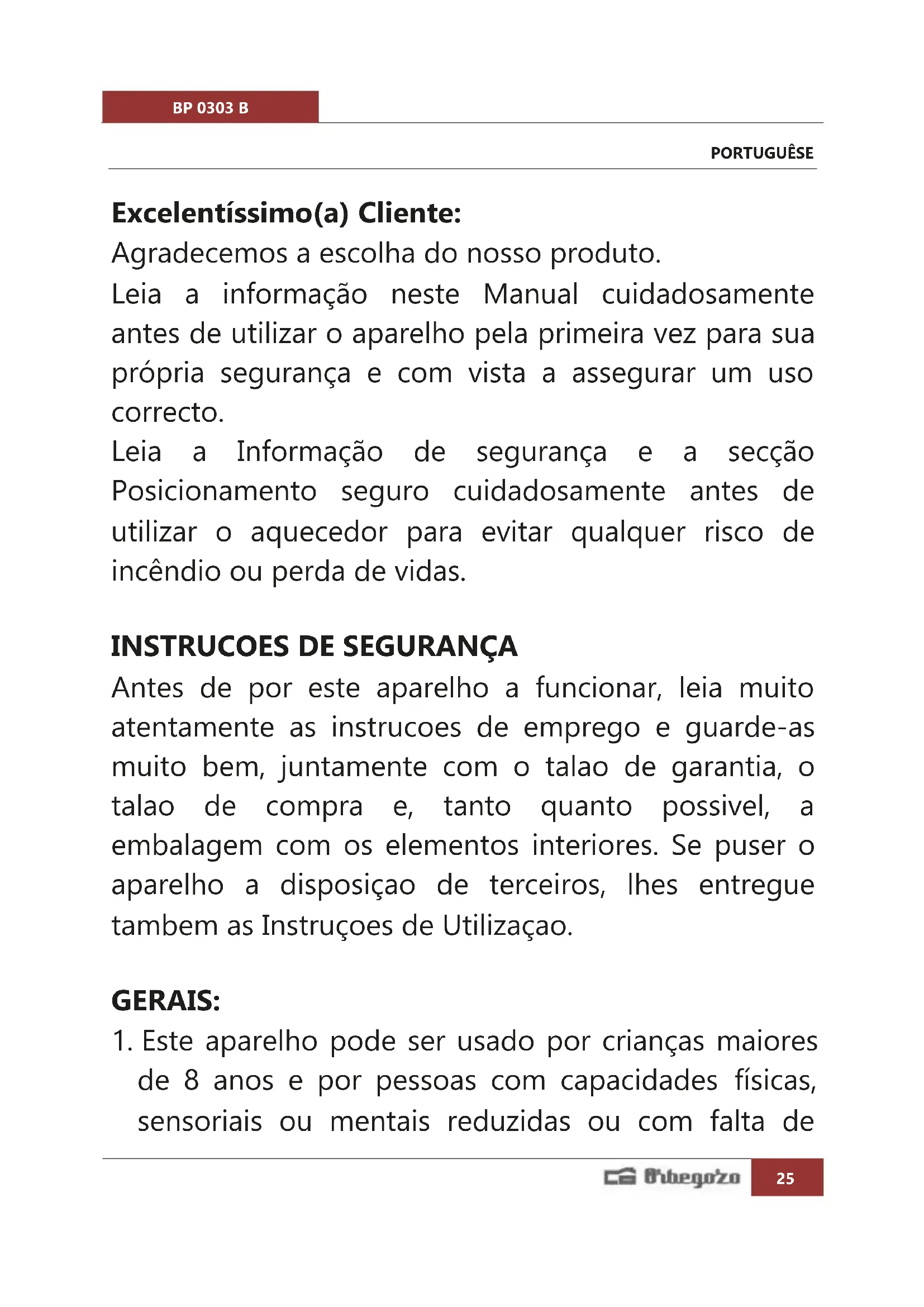 BP 0303 B - Aquecimento Orbegozo - Manual de utilização gratuito