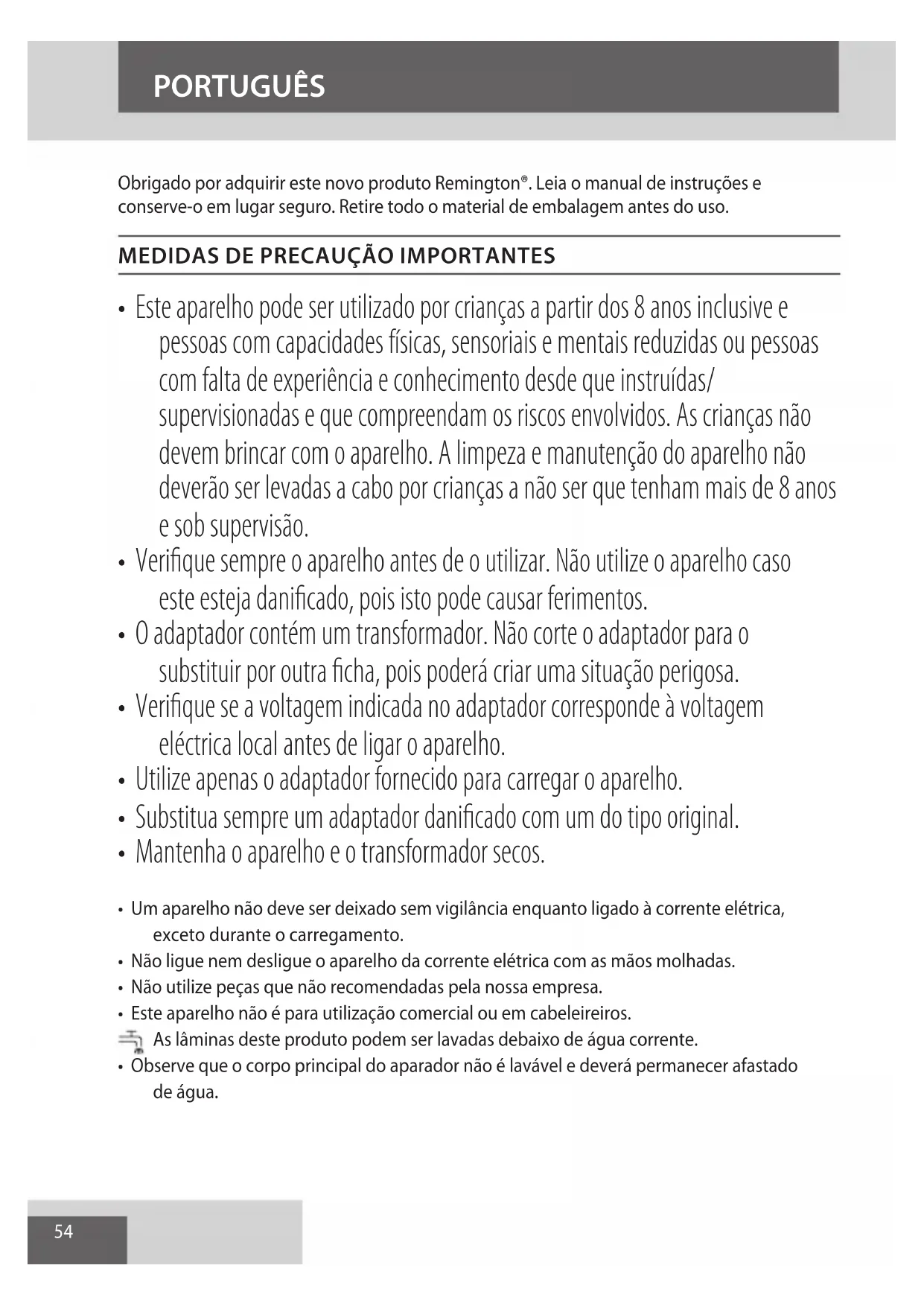 Obrigado por adquirir este novo produto Remington. Leia omanual de instruções e conserve-o em lugar seguro. Retire todo o material de embalagem antes do uso.