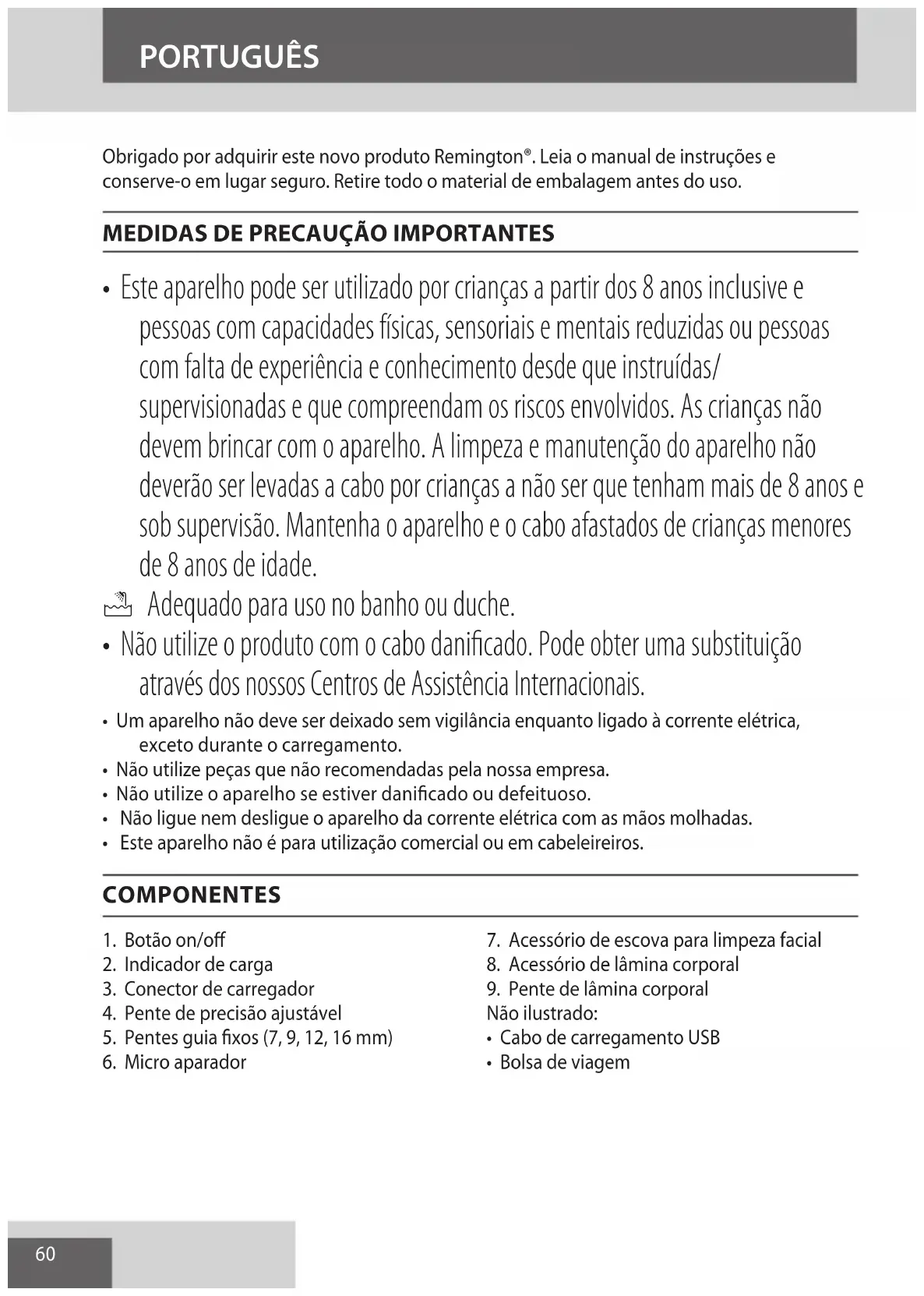 AE60 Obrigado por adquirir este novo produto Remington®. Leia o manual de instruções e conserve-o em lugar seguro. Retire todo o material de embalagem antes do uso.