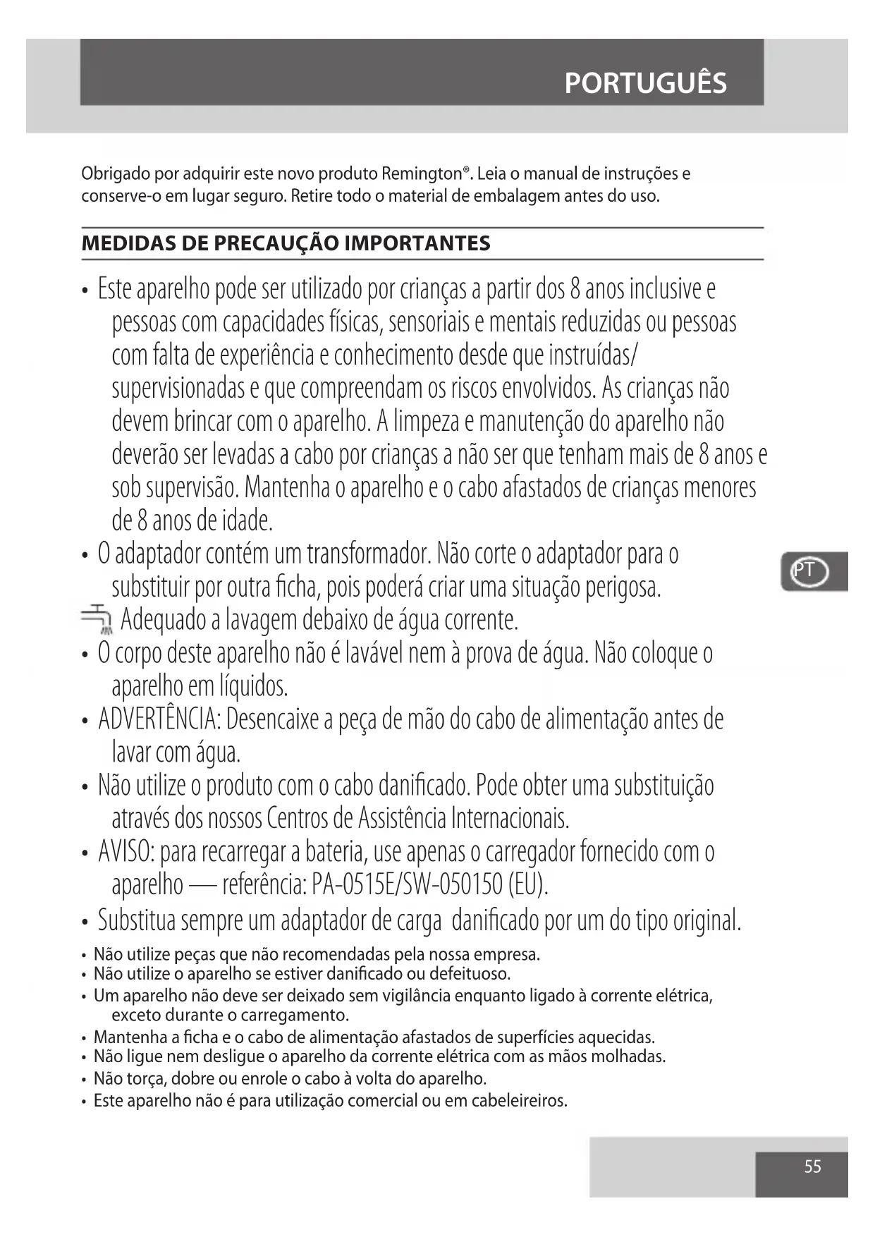 - AVISO: para recarregar a bateria, use apenas o carregador fornecido com o aparelho — referência: PA-0515E/SW-050150 (EU).