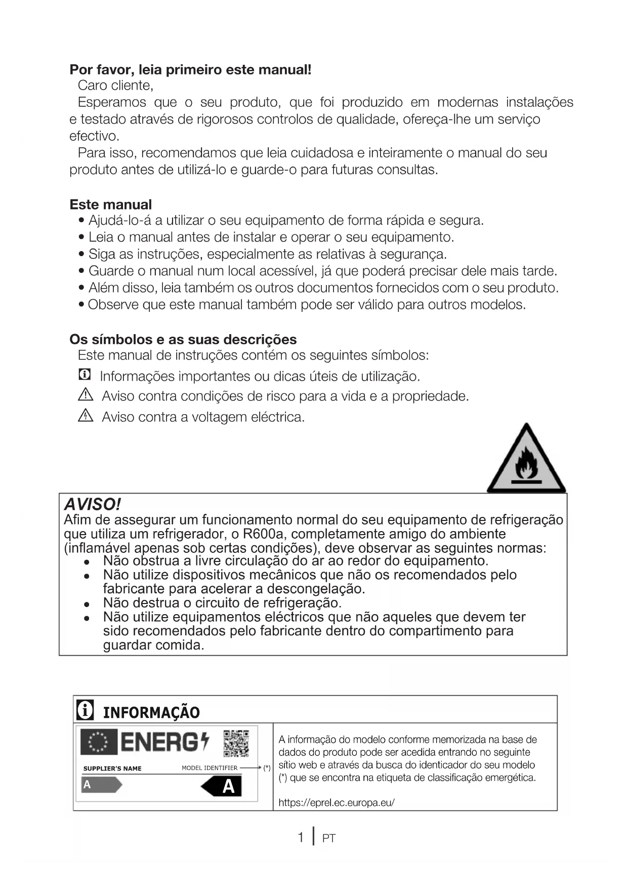 Afim de assegurar um functiOnamento normal do seu equipamento de refrigeracao que utilize um refrigerador, o R600a, completenessamento amigo do ambiente (inflamavel apenas sobisas condições), deve observar as seguintes normas: