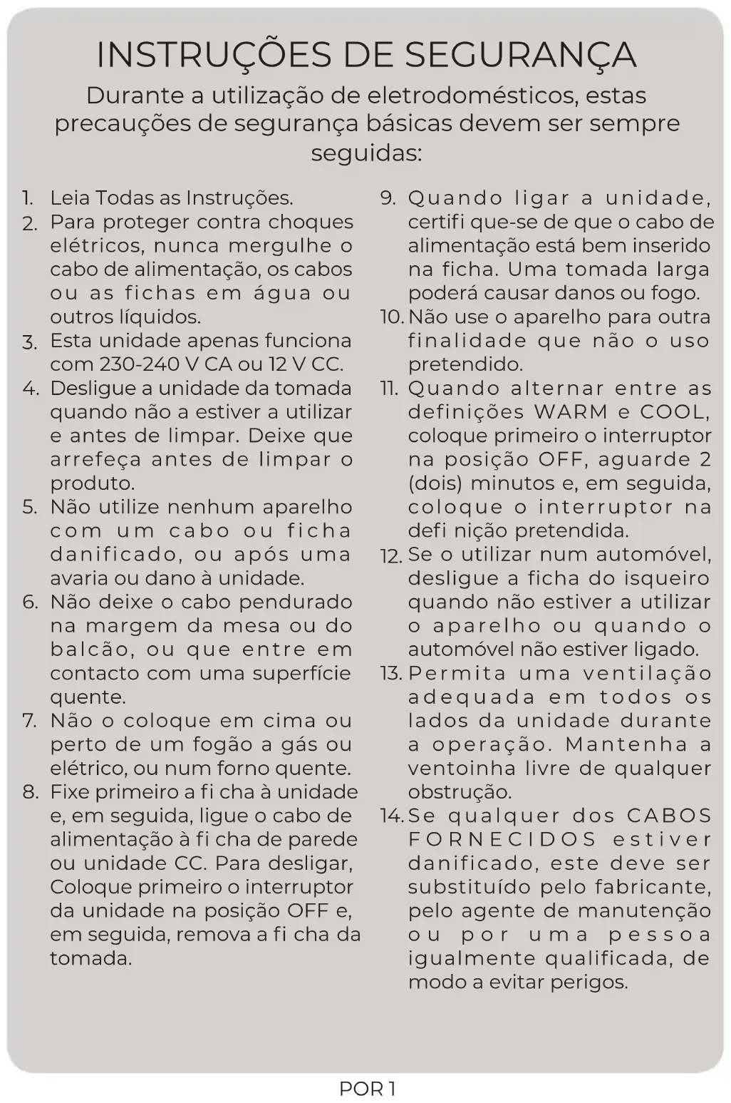Durante a utilização de eletrodomésticos, estas precauções de segurança básicas devem ser sempre seguidas: Leia Todas as Instruções. Para proteger contra choques elétricos, nunca mergulhe o cabo de alimentação, os cabos ou as fichas em água ou outros líquidos. Esta unidade apenas funciona com 230-240 V CA ou 12 V CC. Desligue a unidade da tomada quando não a estiver a utilizar e antes de limpar. Deixe que arrefeça antes de limpar o produto. Não utilize nenhum aparelho com um cabo ou ficha danificado, ou após uma avaria ou dano à unidade. Não deixe o cabo pendurado na margem da mesa ou do balcão, ou que entre em contacto com uma superfície quente. Não o coloque em cima ou perto de um fogão a gás ou elétrico, ou num forno quente. Fixe primeiro a fi cha à unidade e, em seguida, ligue o cabo de alimentação à fi cha de parede ou unidade CC. Para desligar, Coloque primeiro o interruptor da unidade na posição OFF e, em seguida, remova a fi cha da tomada. Quando ligar a unidade, certifi que-se de que o cabo de alimentação está bem inserido na ficha. Uma tomada larga poderá causar danos ou fogo. Não use o aparelho para outra finalidade que não o uso pretendido. Quando alternar entre as definições WARM e COOL, coloque primeiro o interruptor na posição OFF, aguarde 2 (dois) minutos e, em seguida, coloque o interruptor na defi nição pretendida. Se o utilizar num automóvel, desligue a ficha do isqueiro quando não estiver a utilizar o aparelho ou quando o automóvel não estiver ligado. Permita uma ventilação adequada em todos os lados da unidade durante a operação. Mantenha a ventoinha livre de qualquer obstrução. Se qualquer dos CABOS FORNECIDOS estiver danificado, este deve ser substituído pelo fabricante, pelo agente de manutenção ou por uma pessoa igualmente qualificada, de modo a evitar perigos.