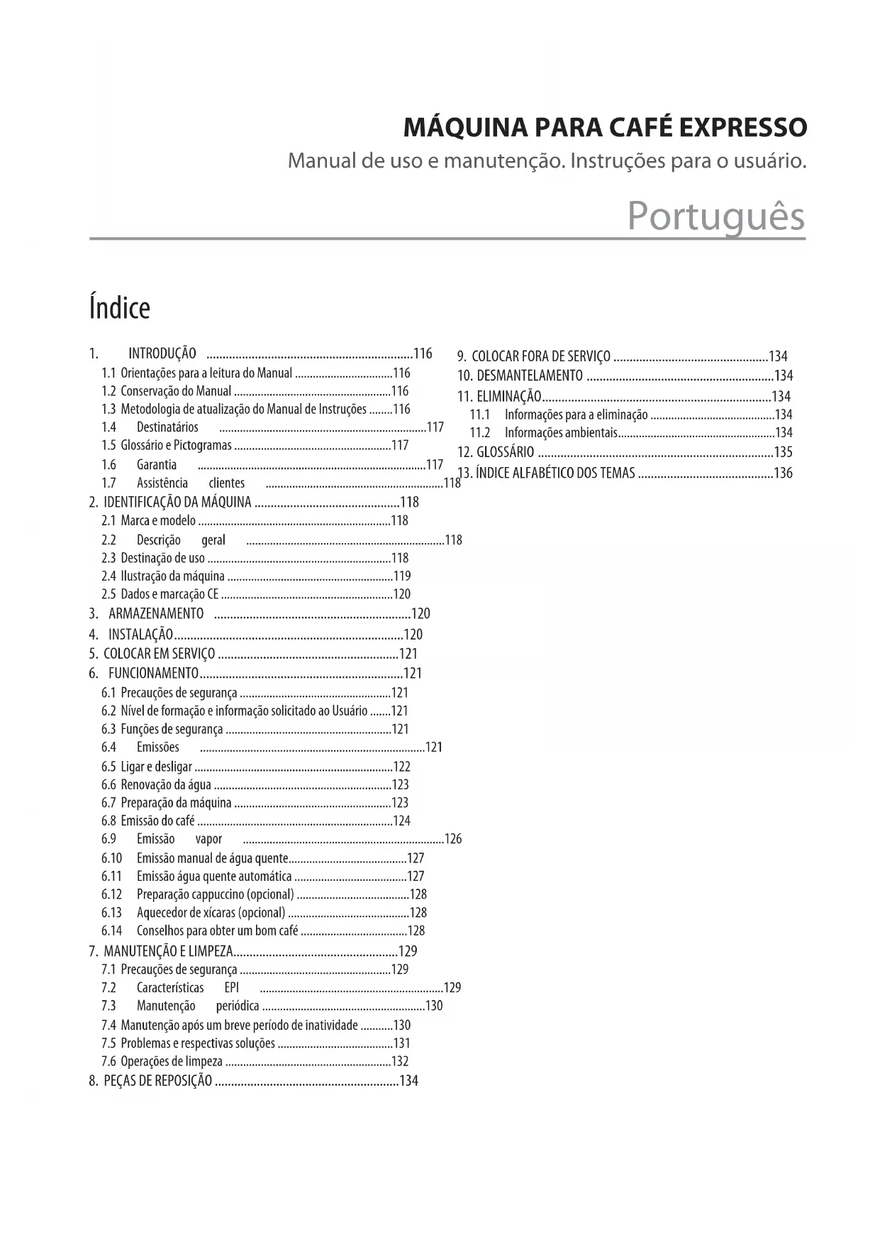 Água quente automática 127Água quente manual 127Aquecedor de xícaras 128Armazenam. máquina 120Assistência clientes 118 Bateria interna 134 Café - fornecimento 124Cappuccinatore 128Colocar em serviço 121Colocar máquina fora de serviço 134Conselhos 128 Dados técnicos 120Desligar máquina 122Desmantelamento máquina 134Destinação de uso 118Dichiarazione di Conformità CE 113 Eliminação máquina 134Emissões 121Emissões eletromagnéticas 122Emissões sonoras 121EPI - Equipamentos de proteção individual 129 Filtro cego 133Filtro de água 133Formação usuário 121Funcionamento máquina 121Funções de segurança 121 Garantia 117Gás - aquecimento 122Glossário 135Glossário e pictogramas 117Grupo AL 124 Identicação da máquina 118Identicação máquina 120Informações ambientais 134Instalação 120 Lavagem bico vapor 134Lavagem cappuccinatore 133Lavagem ltro de água e porta-ltro de água 133Lavagem ltros e porta-ltros 133Lavagem grupo distribuição 133Ligação da máquina 122Limpeza cappuccinatore 133Limpeza máquina 132 Manual de Instruções - Atualização 116Manutenção e limpeza 129Manutenção periódica 130Marca - CE 120Marca/Modelo máquina 120Moagem café 123Modelo AEP 119Modelo AL 119Modelo JUNIOR 124Modelo SAE 119 Peças de reposição 134Pictogramas 117Placa de identicação CE 120Porta-ltro de água 133Potência absorvida 120Precauções de segurança 121Problemas e soluções 131 Soluções 131 Vapor 126Vibrações 121Voltagem 120МАШИНА ДЛЯ ПРИГОТОВЛЕНИЯ КОФЕ ЭСПРЕССО Руководство по эксплуатации и техобслуживанию. Инструкции для пользователя.