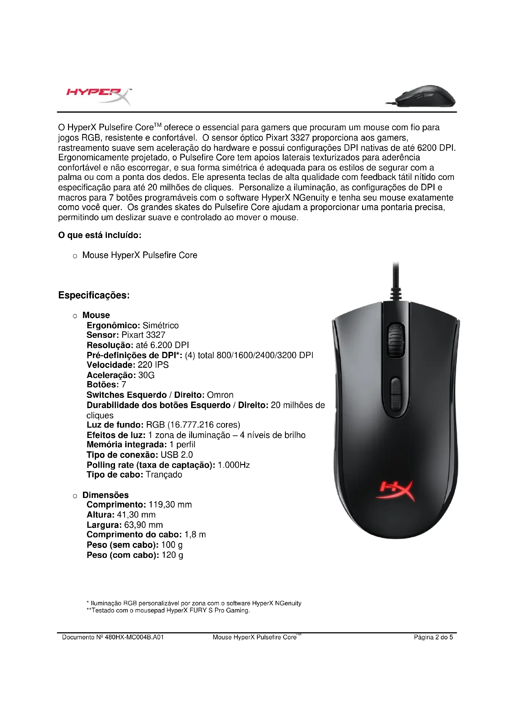 Código do Produto HX-MC004BDocumento Nº 480HX-MC004B.A01 Mouse HyperX Pulsefire Core