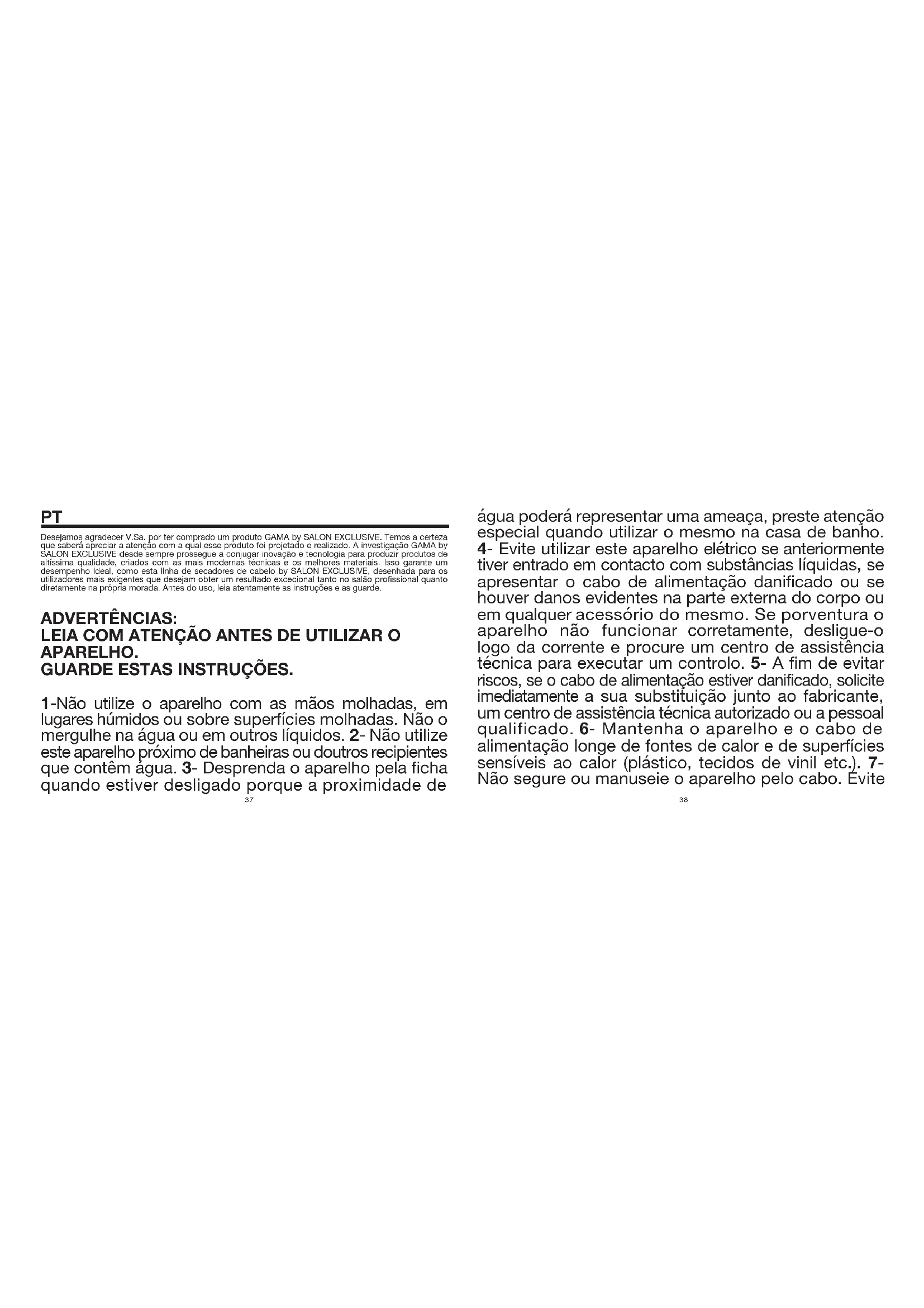 Desejamos agradecer V.Sa. por ter comprado um produto GAMA by SALON EXCLUSIVE. Temos a certeza que saberá apreciar a atenção com a qual esse produto foi projetado e realizado. A investigação GAMA by SALON EXCLUSIVE desde sempre prossegue a conjugar inovação e tecnologia para produzir produtos de altíssima qualidade, criados com as mais modernas técnicas e os melhores materiais. Isso garante um desempenho ideal, como esta linha de secadores de cabelo by SALON EXCLUSIVE, desenhada para os utilizadores mais exigentes que desejam obter um resultado excecional tanto no salão profissional quanto diretamente na própria morada. Antes do uso, leia atentamente as instruções e as guarde. ADVERTÊNCIAS: LEIA COM ATENÇÃO ANTES DE UTILIZAR O APARELHO. GUARDE ESTAS INSTRUÇÕES. 1-Não utilize o aparelho com as mãos molhadas, em lugares húmidos ou sobre superfícies molhadas. Não o mergulhe na água ou em outros líquidos. 2- Não utilize este aparelho próximo de banheiras ou doutros recipientes que contêm água. 3- Desprenda o aparelho pela ficha quando estiver desligado porque a proximidade de