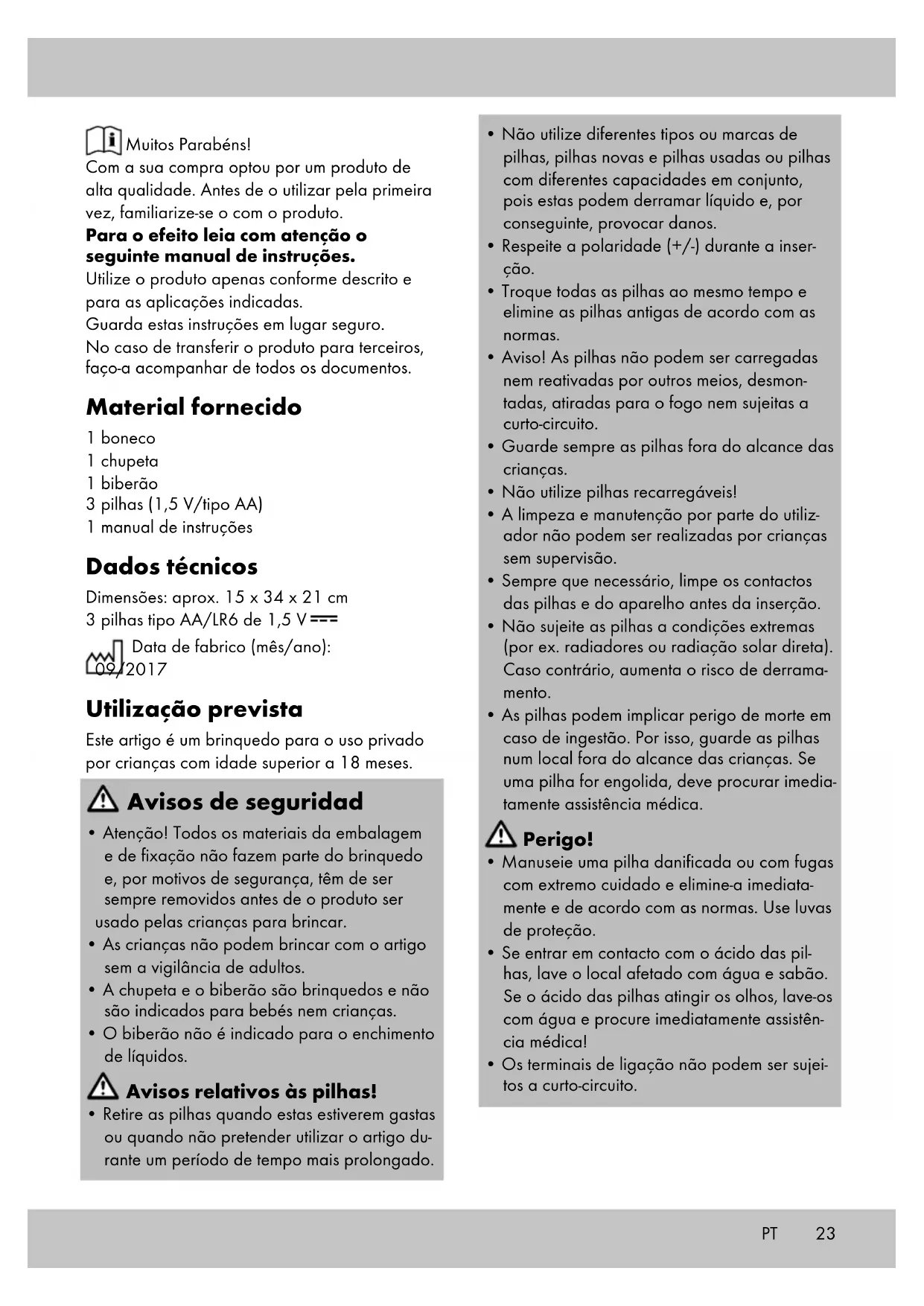 - Se pressionar novamente, ouve-se outros sons. Nota: Quando pressiona a barriga do boneco, ouve-se 16 sons diferentes no total. Armazenamento e limpeza Armazenar o artigo sempre seco e limpo num local com temperatura constante. Limpar apenas com um pano de limpeza seco. IMPORTANTE! Nunca limpar com produtos de limpeza abrasivos. Vestuário e gorro do boneco: Instruções para a eliminação Elimine o artigo e os materiais da embalagem de acordo com as normas locais atuais. Os materiais da embalagem, como por ex. o saco de plástico, não devem estar ao alcance das crianças. Guarde o material da embalagem fora do alcance das crianças. Os aparelhos identificados com o símbolo ao lado não podem ser eliminados no lixo doméstico. Está obrigado a eliminar em separado esses aparelhos elétricos e eletrónicos em fim de vida. Informe-se na sua entidade muni- cipal sobre as opções de eliminação regulada. Remova as pilhas do artigo antes de o eliminar. Medidas a tomar para a eli- minação das pilhas Tenha em atenção: Que se trata de baterias e lixo especial que, de acordo com a legislação, não deve ser eliminado no lixo doméstico. Pode entregar gratuitamente as baterias gastas nos pontos de recolha municipais ou no distribuidor. Nesses locais encontrará recipientes de recolha especiais para o efeito.25PT Indicações sobre a garantia e o processamento de serviço O produto foi produzido com os maiores cuida- dos e sob constante controlo. Com este produto obtém uma garantia de três anos, válida a partir da data de aquisição. Guarde o talão de compra. A garantia apenas é válida para defeitos de material e fabrico e é anulada em caso de utili- zação errada ou inadequada do produto. Os seus direitos legais, especialmente os direitos de garantia do consumidor, não são limitados pela presente garantia. Em caso de eventuais reclamações, queira contactar o serviço de atendimento abaixo mencionada ou entre em contacto connosco via e-mail. Os nossos empregados do serviço de atendimento irão combinar consigo o mais rapi- damente possível o procedimento subsequente. Atendê-lo-emos pessoalmente em cada caso. Segundo a DL 67/2003, com a troca do apa- relho dá-se início a um novo prazo de garantia. Depois de expirada a garantia, eventuais repa- rações implicam o pagamento de custos. IAN: 290753 Assistência Portugal Tel.: 70778 0005 (0,12 EUR/Min.) E-Mail: deltasport@lidl.pt262728 IAN 290753