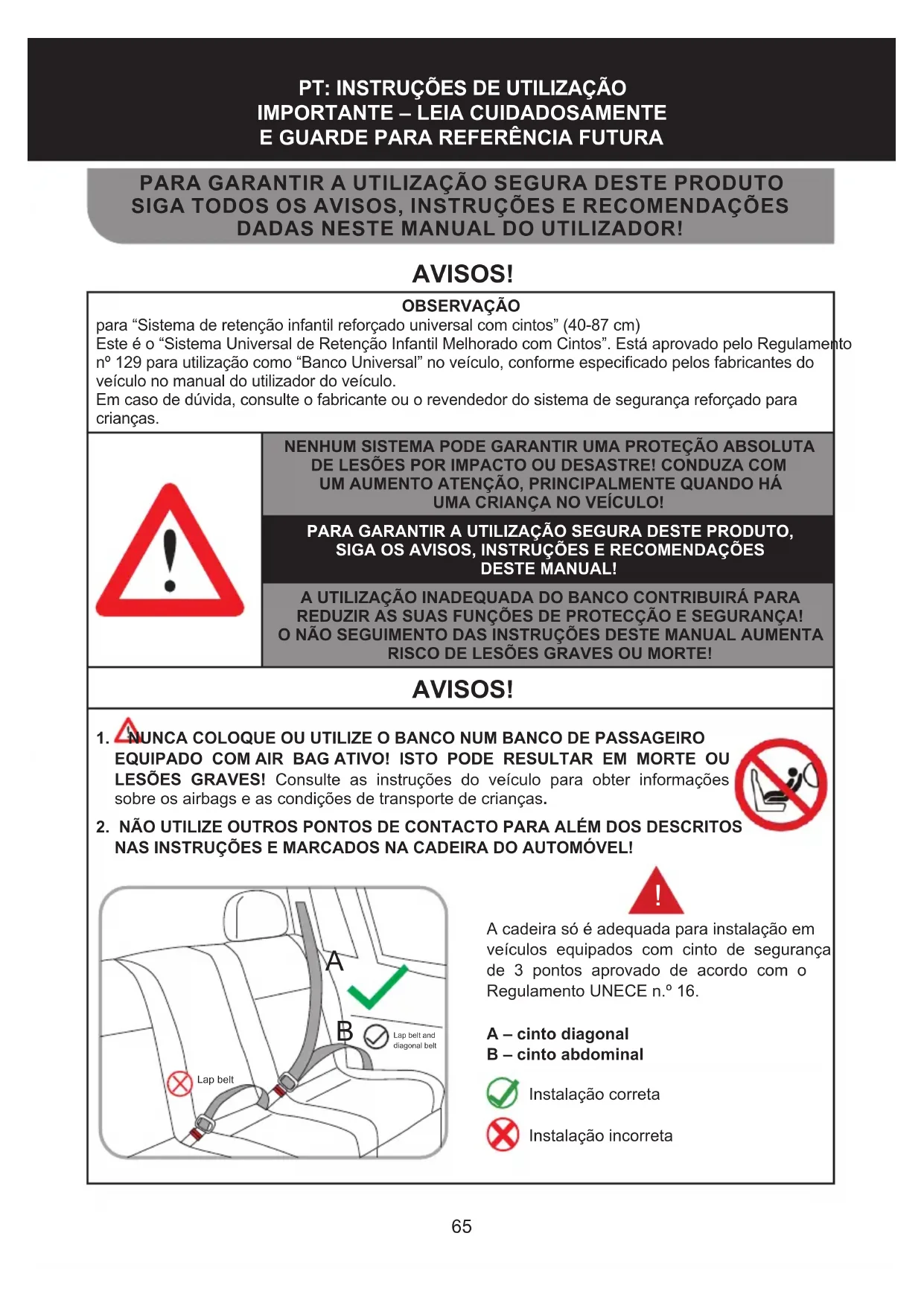 AVISOS! OBSERVAÇÃOpara “Sistema de retenção infantil reforçado universal com cintos” (40-87 cm)Este é o “Sistema Universal de Retenção Infantil Melhorado com Cintos”. Está aprovado pelo Regulamento nº 129 para utilização como “Banco Universal” no veículo, conforme especicado pelos fabricantes do veículo no manual do utilizador do veículo.Em caso de dúvida, consulte o fabricante ou o revendedor do sistema de segurança reforçado para crianças.NENHUM SISTEMA PODE GARANTIR UMA PROTEÇÃO ABSOLUTADE LESÕES POR IMPACTO OU DESASTRE! CONDUZA COM UM AUMENTO ATENÇÃO, PRINCIPALMENTE QUANDO HÁ UMA CRIANÇA NO VEÍCULO!PARA GARANTIR A UTILIZAÇÃO SEGURA DESTE PRODUTO,SIGA OS AVISOS, INSTRUÇÕES E RECOMENDAÇÕES DESTE MANUAL!A UTILIZAÇÃO INADEQUADA DO BANCO CONTRIBUIRÁ PARA REDUZIR AS SUAS FUNÇÕES DE PROTECÇÃO E SEGURANÇA!O NÃO SEGUIMENTO DAS INSTRUÇÕES DESTE MANUAL AUMENTARISCO DE LESÕES GRAVES OU MORTE! AVISOS! 1. NUNCA COLOQUE OU UTILIZE O BANCO NUM BANCO DE PASSAGEIRO EQUIPADO COM AIR BAG ATIVO! ISTO PODE RESULTAR EM MORTE OU LESÕES GRAVES! Consulte as instruções do veículo para obter informações sobre os airbags e as condições de transporte de crianças.2. NÃO UTILIZE OUTROS PONTOS DE CONTACTO PARA ALÉM DOS DESCRITOS NAS INSTRUÇÕES E MARCADOS NA CADEIRA DO AUTOMÓVEL!Lap beltLap belt anddiagonal belt