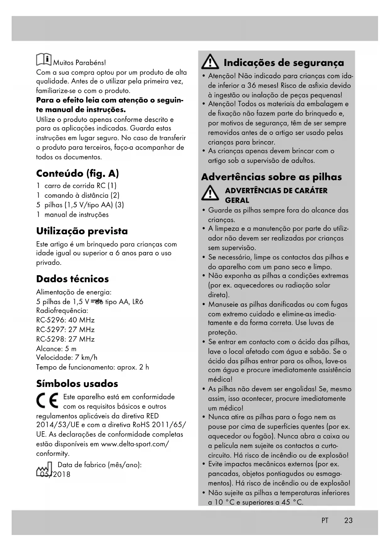continue a não se deslocar em linha reta. Armazenamento e limpeza Armazenar o artigo sempre seco e limpo num local com temperatura constante. Lavar apenas com água e, de seguida, secar com um pano de limpeza. IMPORTANTE! Nunca limpar com produtos de limpeza abrasivos. Instruções para a eliminação Elimine o artigo e os materiais da embalagem de acordo com as normas locais atuais. Os materiais da embalagem, como por ex. o saco de plástico, não devem estar ao alcance das crianças. Gu- arde o material da embalagem fora do alcance das crianças. Os aparelhos identificados com o símbolo ao lado não podem ser eliminados no lixo doméstico. Está obrigado a eliminar em separado esses aparelhos elétricos e eletrónicos em fim de vida. Informe-se na sua entidade municipal sobre as opções de eliminação regulada. Remova as pilhas do artigo antes de o eliminar. Medidas a tomar para a elimi- nação das pilhas Tenha em atenção: Que se trata de baterias e lixo especial que, de acordo com a legislação, não deve ser eliminado no lixo doméstico. Pode entregar gratuitamente as baterias gastas nos pontos de recolha municipais ou no distribuidor. Nesses locais encontrará recipientes de recolha especiais para o efeito. Indicações sobre a garantia e o processamento de serviço O produto foi produzido com os maiores cuidados e sob constante controlo. Com este produto obtém uma garantia de três anos, válida a partir da data de aquisição. Guarde o talão de compra. A garantia apenas é válida para defeitos de material e fabrico e é anulada em caso de utilização errada ou inadequada do produto. Os seus direitos legais, especialmente os direitos de garantia do consumidor, não são limitados pela presente garantia. Em caso de eventuais reclamações, queira contactar o serviço de atendimento abaixo menci- onada ou entre em contacto connosco via e-mail. Os nossos empregados do serviço de atendimen- to irão combinar consigo o mais rapidamente possível o procedimento subsequente. Atendê-lo- emos pessoalmente em cada caso. Segundo a DL 67/2003, com a troca do aparel- ho dá-se início a um novo prazo de garantia. Depois de expirada a garantia, eventuais repa- rações implicam o pagamento de custos. IAN: 302451 Assistência Portugal Tel.: 70778 0005 (0,12 EUR/Min.) E-Mail: deltasport@lidl.pt262728 IAN 302451