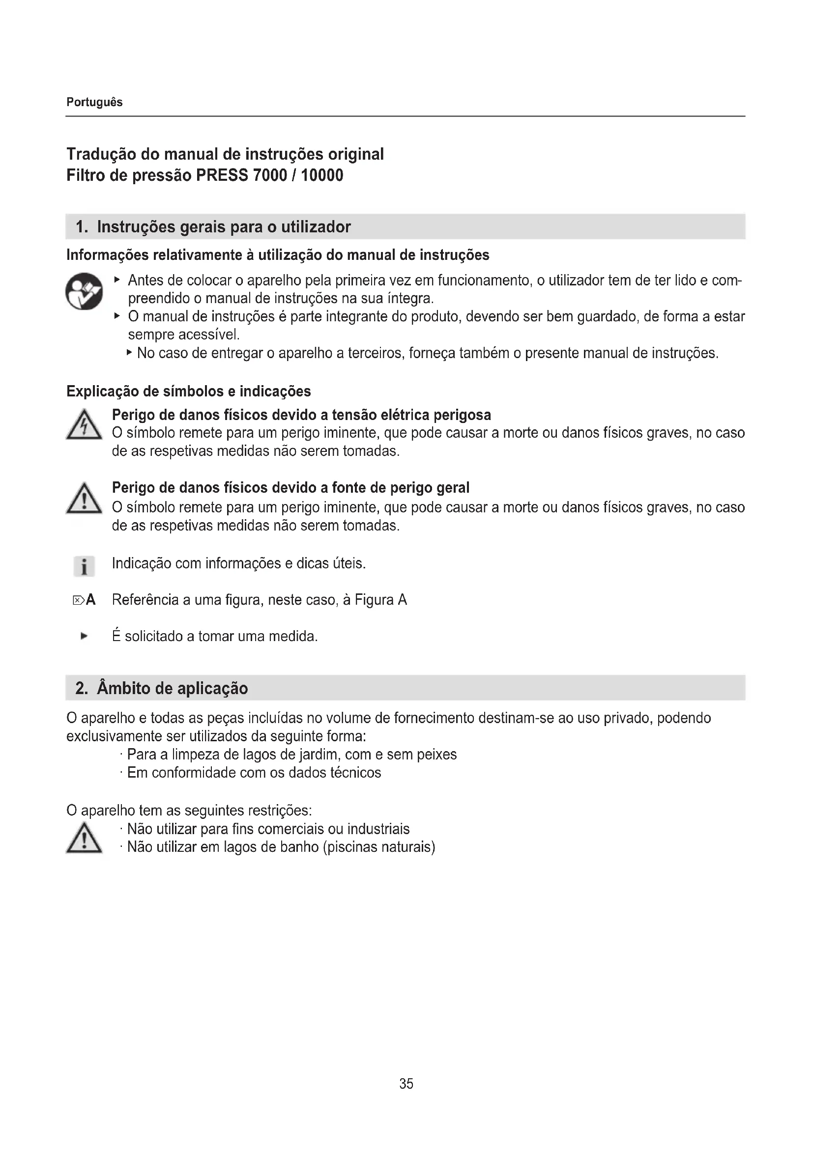Português Tradução do manual de instruções original Filtro de pressão PRESS 7000 / 10000