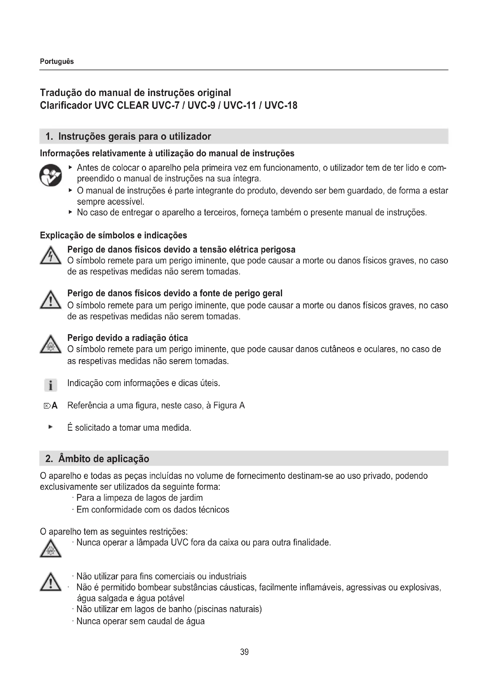 Português Tradução do manual de instruções original Claricador UVC CLEAR UVC-7 / UVC-9 / UVC-11 / UVC-18