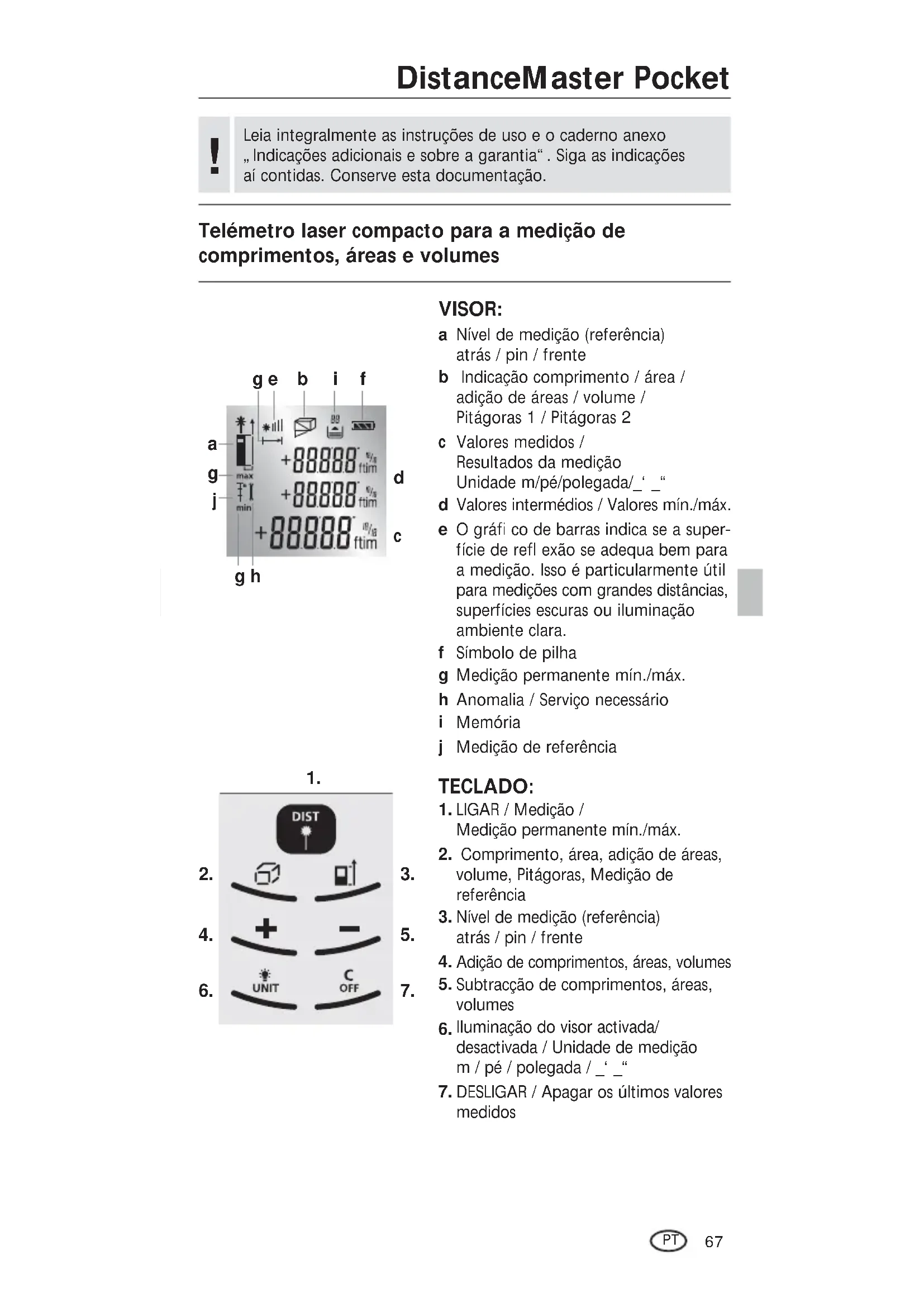 LIGAR / Medição / Medição permanente mín./máx. Comprimento, área, adição de áreas, volume, Pitágoras, Medição de referênciaNível de medição (referência) atrás / pin / frenteAdição de comprimentos, áreas, volumesSubtracção de comprimentos, áreas, volumesIluminação do visor activada/desactivada / Unidade de medição m / pé / polegada / _‘ _“DESLIGAR / Apagar os últimos valores medidos Telémetro laser compacto para a medição de comprimentos, áreas e volumes 1.3Karte_Manual_DistanceMaster-Pocket_Rev.0612.indd 67 02.08.12 10:263 sec