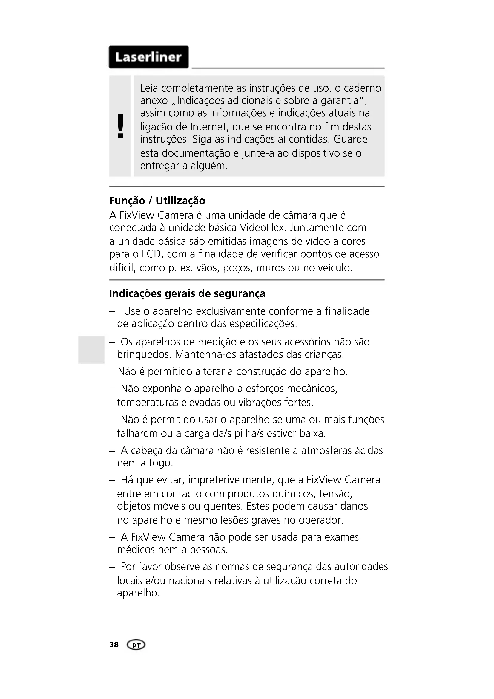 Função / Utilização A FixView Camera é uma unidade de câmara que é conectada à unidade básica VideoFlex. Juntamente com a unidade básica são emitidas imagens de vídeo a cores para o LCD, com a nalidade de vericar pontos de acesso difícil, como p.ex. vãos, poços, muros ou no veículo. Indicações gerais de segurança – Use o aparelho exclusivamente conforme a nalidade de aplicação dentro das especicações. – Os aparelhos de medição e os seus acessórios não são brinquedos. Mantenha-os afastados das crianças. – Não é permitido alterar a construção do aparelho. – Não exponha o aparelho a esforços mecânicos, temperaturas elevadas ou vibrações fortes. – Não é permitido usar o aparelho se uma ou mais funções falharem ou a carga da/s pilha/s estiver baixa. – A cabeça da câmara não é resistente a atmosferas ácidas nem a fogo. – Há que evitar, impreterivelmente, que a FixView Camera entre em contacto com produtos químicos, tensão, objetos móveis ou quentes. Estes podem causar danos no aparelho e mesmo lesões graves no operador. – A FixView Camera não pode ser usada para exames médicos nem a pessoas. – Por favor observe as normas de segurança das autoridades locais e/ou nacionais relativas à utilização correta do aparelho. PTFixView Camera