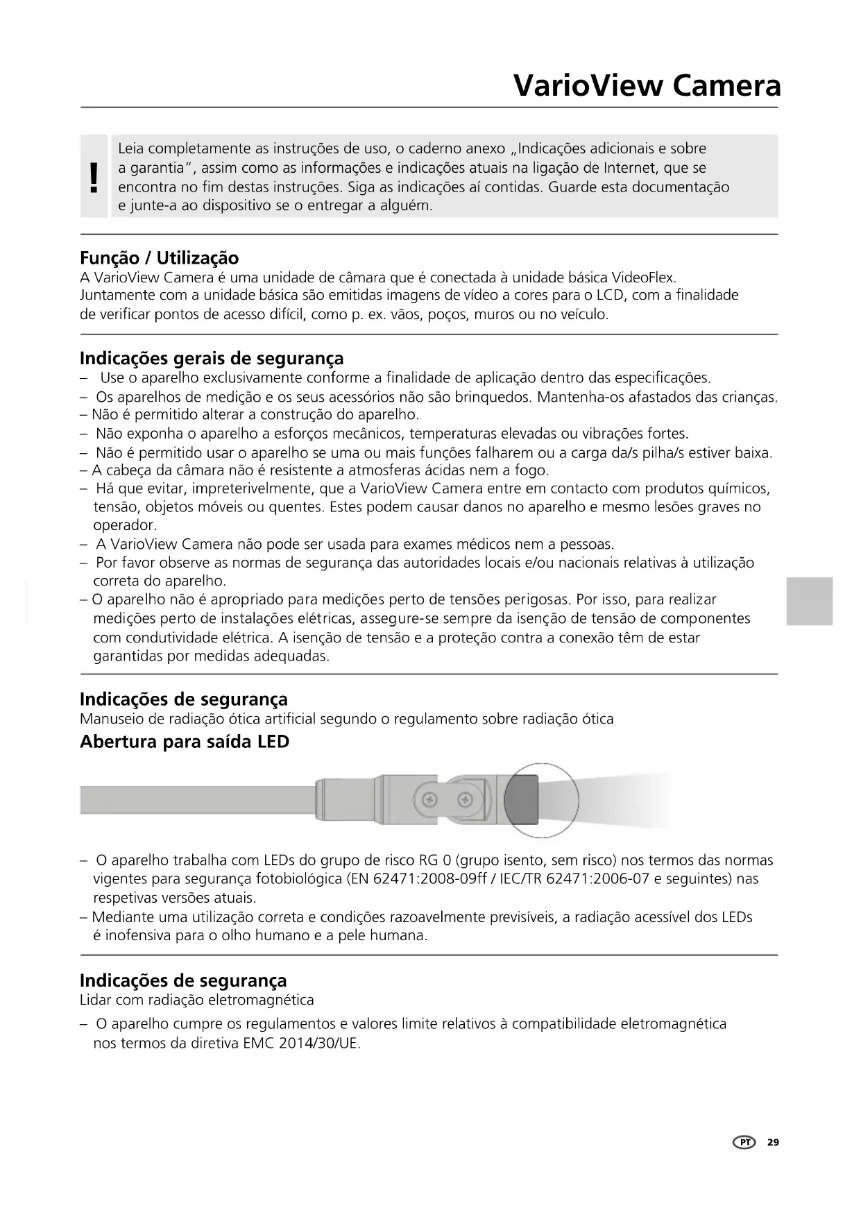 - Ha que evitar, impreterivelmente, que a VarioView Camera entre em contacto com produits químicos, tensão, objetos moveris ou quentes. Estes podem causar danos no aparecido e mesmo lesões graves no operador.