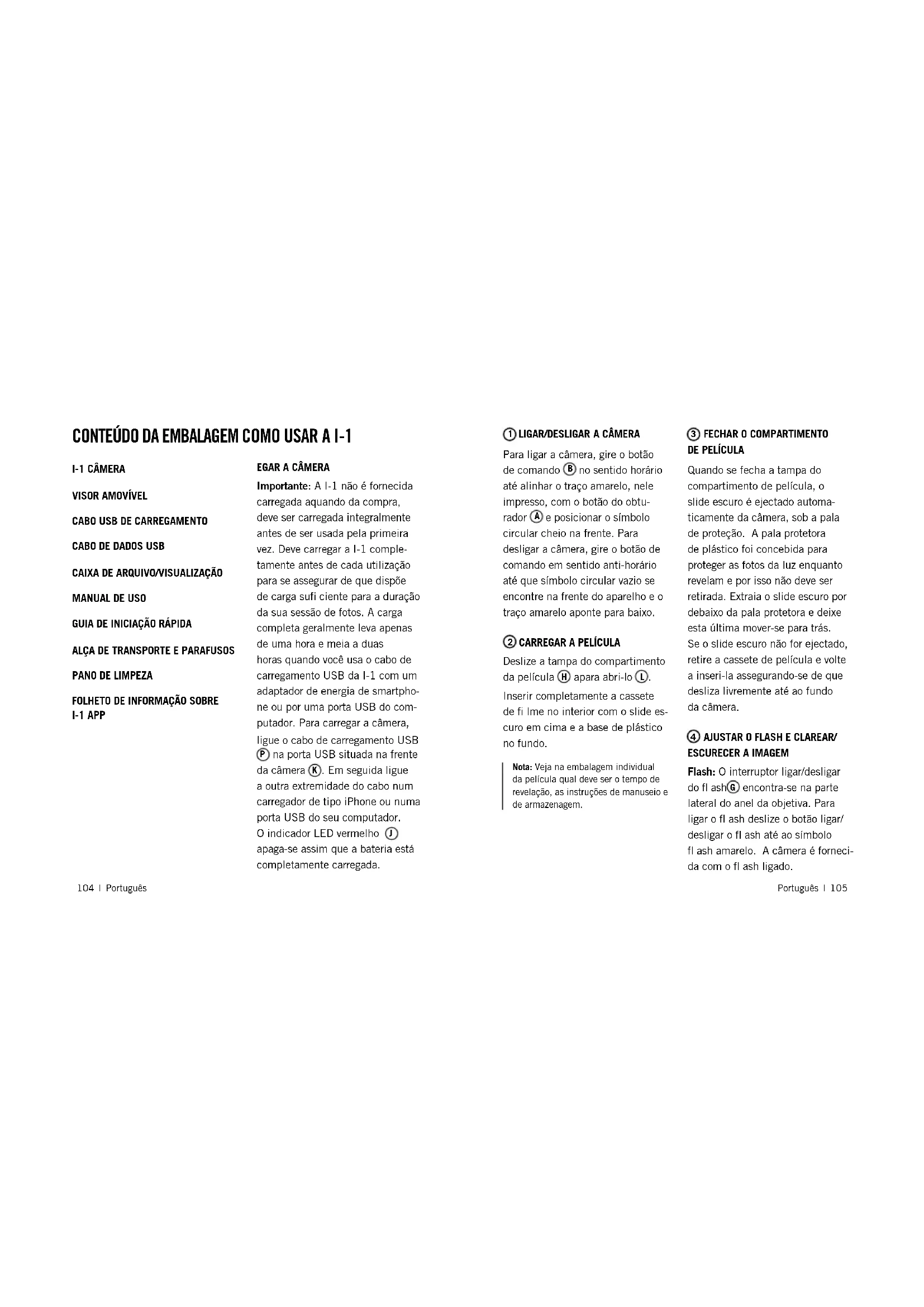 põe-se a piscar e o fl ash deixa de funcionar. Neste estado, a câmera só deve ser usada para fotografar om luz direta e intensa do sol.c ORIENTAÇÕES ADICIONAIS110 | Português Importante: Devido às altas exigências de poder do anel do fl ash, recomen- damos que você sempre carregue a câmera I-1 antes de sua utilização, por cerca de uma hora, usando o cabo de carregamento USB fornecido.