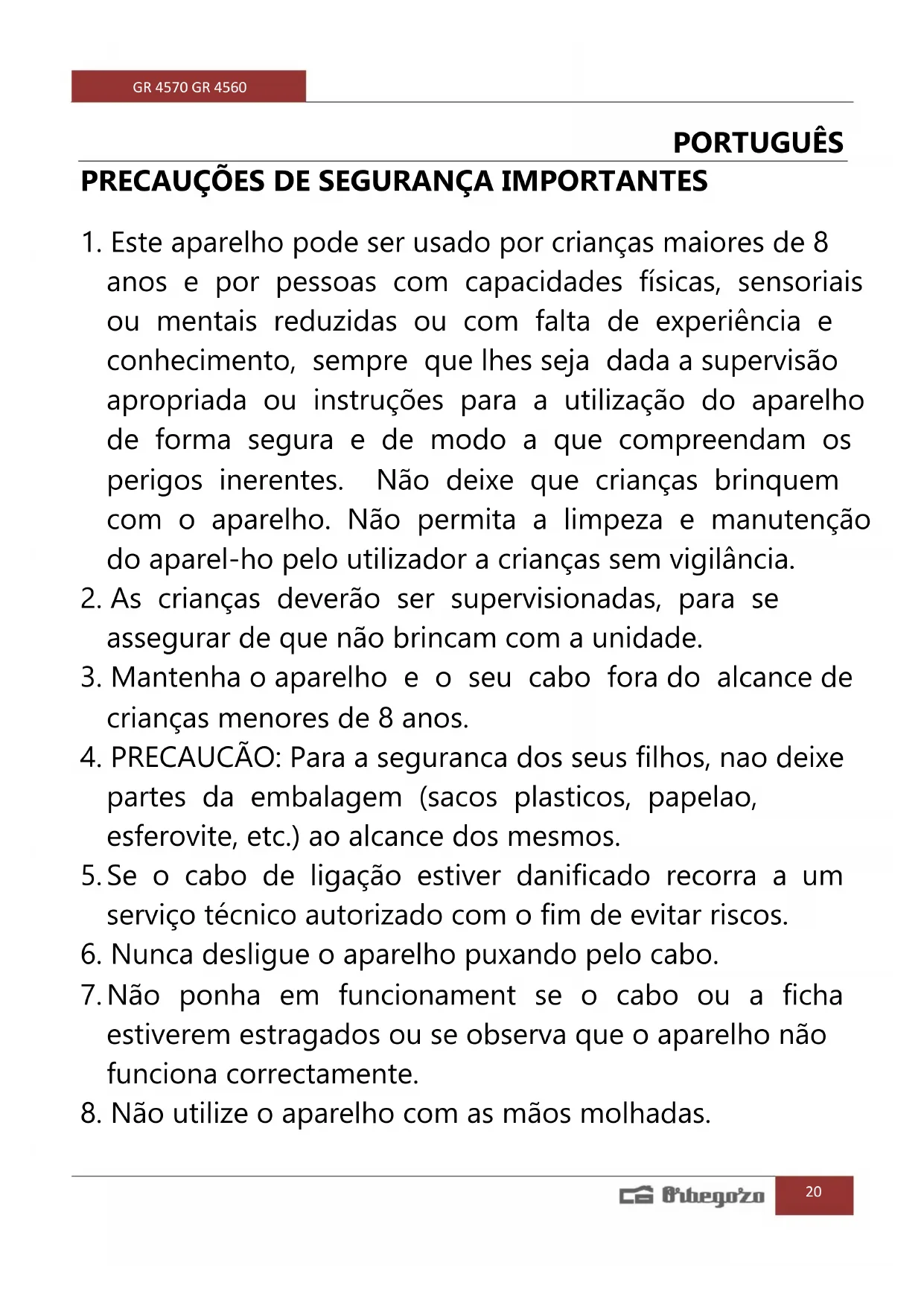 Encontre gratuitamente o manual do aparelho GR 4570 Orbegozo em formato PDF.