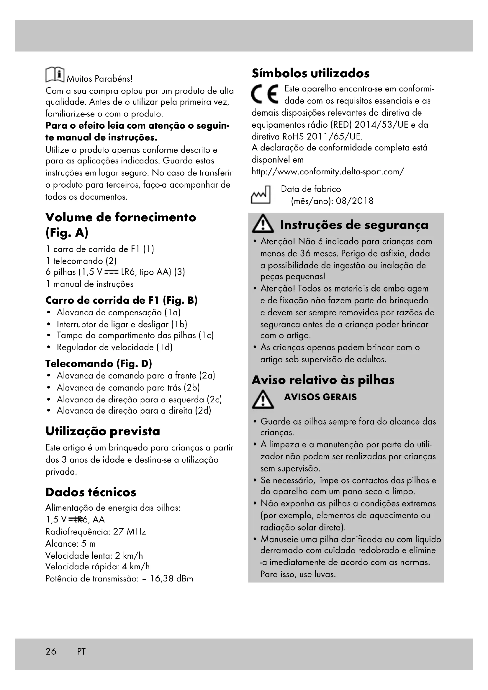 - Alavanca de direção para a direita (2d) Utilização prevista Este artigo é um brinquedo para crianças a partir dos 3 anos de idade e destina-se a utilização privada. Dados técnicos Alimentação de energia das pilhas: 1,5 V LR6, AA Radiofrequência: 27 MHz Alcance: 5 m Velocidade lenta: 2 km/h Velocidade rápida: 4 km/h Potência de transmissão: – 16,38 dBm Símbolos utilizados Este aparelho encontra-se em conformi- dade com os requisitos essenciais e as demais disposições relevantes da diretiva de equipamentos rádio (RED) 2014/53/UE e da diretiva RoHS 2011/65/UE. A declaração de conformidade completa está disponível em http://www.conformity.delta-sport.com/ Data de fabrico (mês/ano): 08/2018 Instruções de segurança