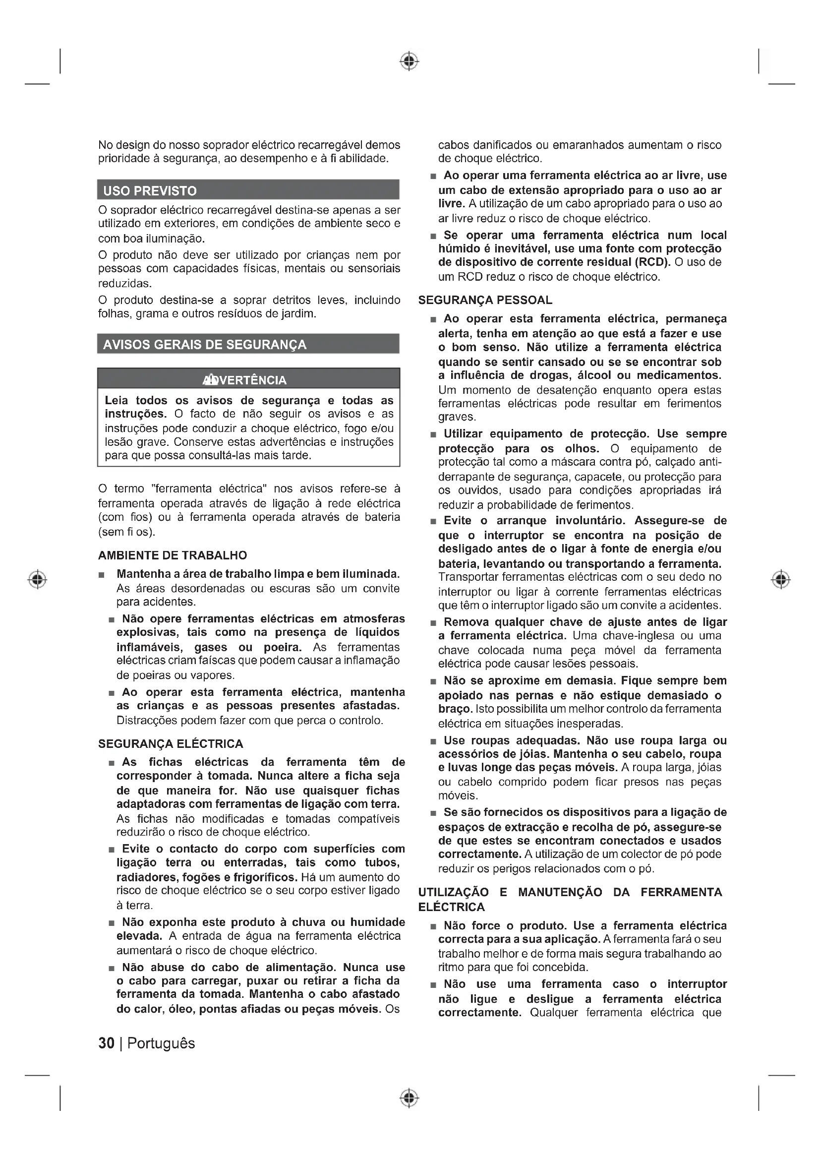 não possa ser controlada com o interruptor é perigosa e deve ser reparada. ■ Desligue a ficha da alimentação eléctrica e/ ou a bateria da ferramenta antes de proceder a quaisquer ajustes, substituição de acessórios ou de armazenar a ferramenta. Estas medidas de segurança preventivas reduzem o risco de arranque acidental da ferramenta eléctrica. ■ Armazene as ferramentas eléctricas fora do alcance das crianças e não permita que pessoas não familiarizadas com a ferramenta eléctrica ou com estas instruções utilizem a ferramenta eléctrica. As ferramentas eléctricas são perigosas nas mãos de utilizadores inexperientes. ■ Realize a manutenção das ferramentas eléctricas. Verifique se existe desalinhamento ou emperramento das peças móveis, ruptura das peças e qualquer outra condição que possa ter afectado o funcionamento da ferramenta eléctrica. Se danificado, mande a ferramenta eléctrica ser reparada antes de a utilizar. Muitos acidentes são causados por ferramentas eléctricas com fracas manutenções. ■ Mantenha as ferramentas de corte afiadas e limpas. É menos provável que as ferramentas de corte com uma correcta manutenção e com pontas de corte afiadas fiquem presas e são mais fáceis de controlar. ■ Utilize a ferramenta, acessórios, peças eléctricas, etc., de acordo com estas instruções, tendo em conta as condições de trabalho e o trabalho que se vai realizar. O uso da ferramenta eléctrica para as operações diferentes daquelas a que se destina podem causar uma situação perigosa. UTILIZAÇÃO E MANUTENÇÃO DA BATERIA ■ Recarregue apenas com o carregador especificado pelo fabricante. Um carregador que seja adequado para um tipo de bateria pode causar risco de incêndio, quando utilizado com outra bateria. ■ Use ferramentas eléctricas somente com baterias especificamente concebidas. O uso de qualquer outro tipo de bateria pode causar risco de lesões e incêndio. ■ Quando a bateria não estiver a ser utilizada, mantenha-a afastada de outros objectos metálicos como clipes de papel, moedas, chaves, pregos, parafusos, ou outros pequenos objectos metálicos que podem fazer a ligação de um terminal para outro. Ligar os terminais da bateria em conjunto pode causar queimaduras ou um incêndio. ■ Sob circunstâncias abusivas, o líquido pode ser ejectado da bateria, evite o contacto. Se o contacto ocorrer acidentalmente, limpe com água abundante. Se o líquido entrar em contacto com os olhos, procure adicionalmente assistência médica. O líquido ejectado da bateria pode causar irritação ou queimaduras. MANUTENÇÃO ■ A manutenção da sua ferramenta eléctrica deve ser efectuada por uma pessoa qualificada para reparações, utilizando apenas peças de substituição idênticas. Isto assegurará que a segurança da ferramenta eléctrica é mantida. AVISOS DE SEGURANÇA DO SOPRADOR ELÉCTRICO RECARREGÁVEL ■ Algumas regiões têm normas que restringem o uso do produto para algumas operações. Consulte as autoridades locais ■ Nunca deixe que o aparelho seja utilizado por crianças, pessoas com capacidade física, sensorial ou mental reduzida, pessoas sem experiência nem conhecimentos nem pessoas que não estejam familiarizadas com estas instruções. A legislação local pode restringir a idade do operador. ■ Mantenha em mente que o operador ou o utilizador é responsável pelos acidentes ou perigos que ocorrem a outras pessoas ou à sua propriedade. ■ Mantenha os transeuntes, as crianças e os animais a 15 m de distância da zona de operação. Desligue o aparelho se alguém entrar na área. ■ Durante o funcionamento do produto, use sempre calçado forte e calças longas. Não opere a máquina se estiver descalço ou se usar sandálias. Evite usar roupa larga com cordões ou gravata, porque poderá encravar nas partes móveis. ■ Não use roupa larga nem missangas que possam ir para entrada de ar. ■ Prenda o cabelo comprido para que fique acima do nível dos ombros para evitar que fique emaranhado em peças móveis. ■ Coloque sempre uma proteção para os ouvidos enquanto manipula este aparelho. O produto é extremamente ruidoso e pode provocar lesões de audição permanentes se não se respeitarem estritamente as instruções para limitar a exposição, reduzir o ruido e utilizar proteção auditiva. ■ Coloque sempre uma proteção total para os olhos enquanto manipula este aparelho. O fabricante recomenda encarecidamente o uso de uma máscara completa ou de umas luvas protetoras totalmente fechadas. Os óculos normais ou de sol não são uma proteção adequada. Em qualquer momento, os objetos podem ser projetados a grande velocidade devido ao potente jorro de ar e podem fazer ricochete em superfícies duras em direção ao operador. ■ Certifique-se antes de cada uso que todos os controlos e dispositivos de segurança funcionam corretamente. Não utilize a ferramenta se o interruptor “off” não parar o aparelho. ■ Verifique sempre se não existem danos na armação antes de cada uso. Assegure-se de que as proteções e os cabos estão no seu sítio e bem fixados. ■ Nunca coloque o produto a funcionar com proteções ou defesas defeituosas ou sem dispositivos de segurança, por exemplo coletor de detritos no sítio. ■ Mantenha as entradas de ar para arrefecimento sem obstruções. ■ Antes de apontar o soprador aos resíduos, utilize um ancinho e uma vassoura para desagregar e soltar os resíduos.32 | Português ■ Desimpeça a área onde pretende trabalhar antes de cada utilização. Remova todos os objetos, como pedras, vidros partidos, pregos, arames ou cordas, que podem ser soprado a uma distância considerável pela alta velocidade do ar, ou ficar obstruídos na ventoinha. FUNCIONAMENTO GERAL ■ Opere a máquina apenas em horas convenientes – não cedo de manhã ou tarde à noite, quando as pessoas podem ser perturbadas. ■ Nunca opere o aparelho num ambiente explosivo. ■ Evite u